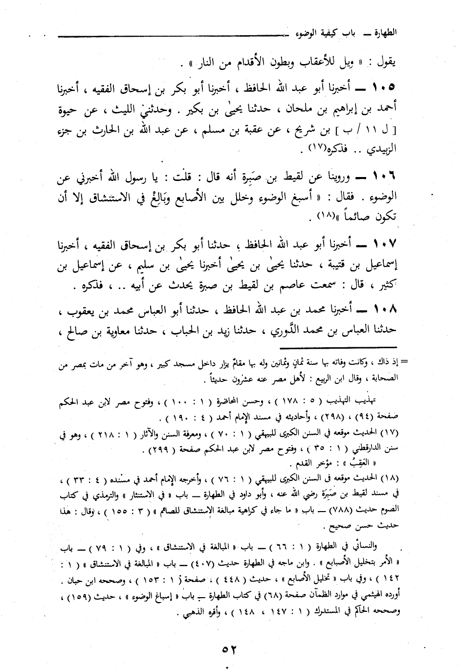 106 - وَرُوِّينَا عَنْ لَقِيطِ بْنِ صَبِرَةَ، أَنَّهُ قَالَ: قُلْتُ: يَا رَسُولَ اللَّهِ، أَخْبِرْنِي عَنِ الْوُضُوءِ. فَقَالَ: «§أَسْبِغِ الْوُضُوءَ، وَخَلِّلْ بَيْنَ الْأَصَابِعِ، وَبَالِغْ فِي الِاسْتِنْشَاقِ، إِلَّا أَنْ تَكُونَ صَائِمًا»