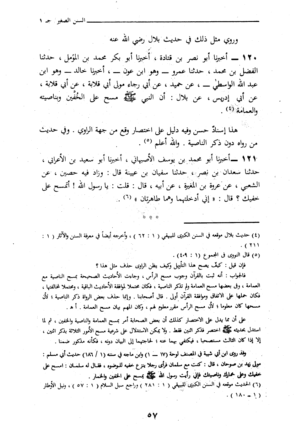 120 - أَخْبَرَنَا أَبُو النَّضْرِ بْنُ قَتَادَةَ، أنا أَبُو بَكْرِ بْنُ مُحَمَّدٍ الْمُؤَمَّلُ، نا الْفَضْلُ بْنُ مُحَمَّدٍ، نا عَمْرٌو وَهُوَ ابْنُ عَوْنٍ، نا خَالِدٌ، وَهُوَ ابْنُ عَبْدِ اللَّهِ الْوَاسِطِيُّ، عَنْ حُمَيْدٍ، عَنْ أَبِي رَجَاءٍ، مَوْلَى أَبِي قِلَابَةَ عَنْ أَبِي قِلَابَةَ، عَنْ أَبِي إِدْرِيسَ، عَنْ بِلَالٍ، أَنَّ النَّبِيَّ صَلَّى اللهُ عَلَيْهِ وَسَلَّمَ § «مَسَحَ عَلَى الْخُفَّيْنِ وَنَاصَيَتِهَ وَالْعِمَامَةِ» هَذَا إِسْنَادٌ حَسَنٌ وَفِيهِ دَلِيلٌ عَلَى اخْتِصَارٍ وَقَعَ مِنْ جِهَةِ الرَّاوِي فِي حَدِيثِ مَنْ رَوَاهُ دُونَ ذِكْرِ النَّاصِيَةِ، وَاللَّهُ أَعْلَمُ