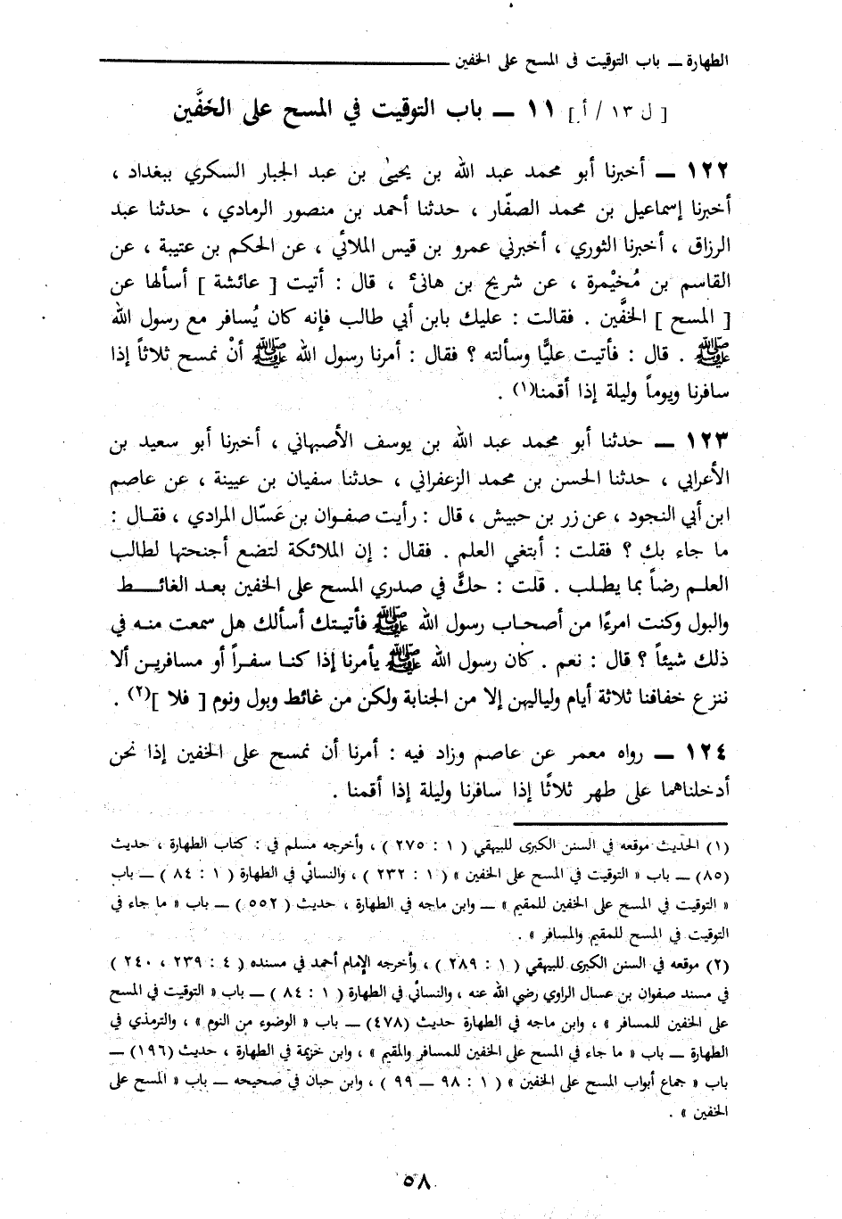 122 - أَخْبَرَنَا أَبُو مُحَمَّدِ بْنُ عَبْدِ اللَّهِ بْنِ يَحْيَى بْنِ عَبْدِ الْجَبَّارِ السُّكَّرِيُّ، بِبَغْدَادَ، أنا إِسْمَاعِيلُ بْنُ مُحَمَّدٍ الصَّفَّارُ، نا أَحْمَدُ بْنُ مَنْصُورٍ الرَّمَادِيُّ، نا عَبْدُ الرَّزَّاقِ، أنا الثَّوْرِيُّ، أَخْبَرَنِي عَمْرُو بْنُ قَيْسٍ الْمُلَائِيُّ، عَنِ الْحَكَمِ بْنِ عُتَيْبَةَ، عَنِ الْقَاسِمِ بْنِ مُخَيْمِرَةَ، عَنْ شُرَيْحِ بْنِ هَانِئٍ، قَالَ: أَتَيْتُ عَائِشَةَ أَسْأَلُهَا عَنِ الْخُفَّيْنِ فَقَالَتْ: عَلَيْكَ بِابْنِ أَبِي طَالِبٍ فَإِنَّهُ كَانَ يُسَافَرُ مَعَ رَسُولِ اللَّهِ صَلَّى اللهُ عَلَيْهِ وَسَلَّمَ. قَالَ: فَأَتَيْتُ عَلِيًّا وَسَأَلْتُهُ فَقَالَ: § «أَمَرَنَا رَسُولُ اللَّهِ صَلَّى اللهُ عَلَيْهِ وَسَلَّمَ أَنْ نَمْسَحَ ثَلَاثًا إِذَا سَافَرْنَا وَيَوْمًا إِذَا أَقَمْنَا»