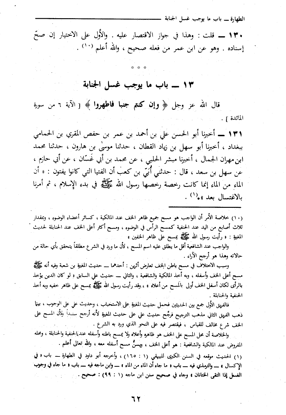 131 - أَخْبَرَنَا أَبُو الْحُسَيْنِ عَلِيُّ بْنُ أَحْمَدَ بْنِ عُمَرَ بْنِ حَفْصٍ الْمُقْرِئُ ابْنُ الْحَمَّامِيِّ بِبَغْدَادَ، أنا أَبُو سَهْلِ بْنُ زِيَادٍ الْقَطَّانُ، نا مُوسَى بْنُ هَارُونَ، نا مُحَمَّدُ بْنُ مِهْرَانَ الْجَمَّالُ، أنا مُبَشِّرٌ الْحَلَبِيُّ، عَنْ مُحَمَّدِ بْنِ أَبِي غَسَّانَ، عَنْ أَبِي حَازِمٍ، عَنْ سَهْلِ بْنِ سَعْدٍ، قَالَ: حَدَّثَنِي أُبَيُّ بْنُ كَعْبٍ، أَنَّ الْفُتْيَا الَّتِي، كَانُوا يُفْتُونَ أَنَّ الْمَاءَ مِنَ الْمَاءِ كَانَتْ § «رُخْصَةً رَخَّصَهَا رَسُولُ اللَّهِ صَلَّى اللهُ عَلَيْهِ وَسَلَّمَ فِي بَدْءِ الْإِسْلَامِ ثُمَّ أَمَرَنَا بِاغْتِسَالٍ بَعْدُ»