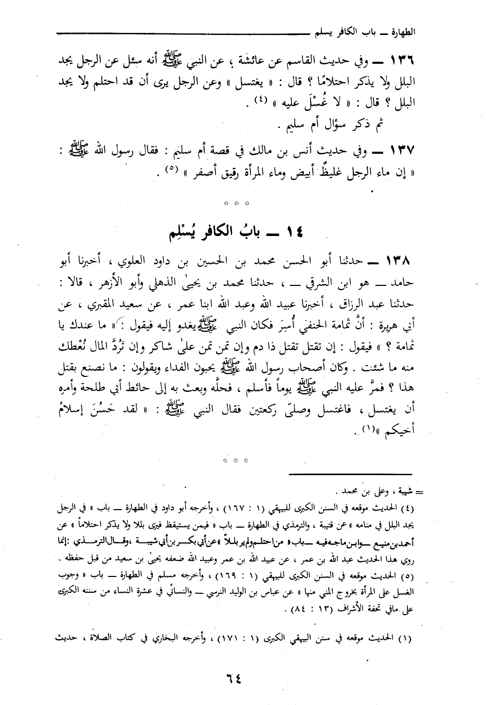 138 - حَدَّثَنَا أَبُو الْحَسَنِ مُحَمَّدُ بْنُ الْحُسَيْنِ بْنِ دَاوُدَ الْعَلَوِيُّ، أنا أَبُو حَامِدٍ هُوَ ابْنُ الشَّرْقِيِّ، نا مُحَمَّدُ بْنُ يَحْيَى الذُّهْلِيُّ، وَأَبُو الْأَزْهَرِ، قَالَا: نا عَبْدُ الرَّزَّاقِ، أنا عُبَيْدُ اللَّهِ، وَعَبْدُ اللَّهِ ابْنَا عُمَرَ، عَنْ سَعِيدٍ الْمَقْبُرِيِّ، عَنْ أَبِي هُرَيْرَةَ، أَنَّ ثُمَامَةَ الْحَنَفِيَّ أُسِرَ فَكَانَ النَّبِيُّ صَلَّى اللهُ عَلَيْهِ وَسَلَّمَ يَغْدُو إِلَيْهِ فَيَقُولُ: مَا عِنْدَكَ يَا ثُمَامَةُ؟ فَيَقُولُ: إِنْ تَقْتُلْ تَقْتُلْ ذَا دَمٍ، وَإِنْ تَمُنَّ تَمُنَّ عَلَى شَاكِرٍ وَإِنْ تُرِدِ الْمَالَ نُعْطِكَ مِنْهُ مَا شِئْتَ. وَكَانَ أَصْحَابُ رَسُولِ اللَّهِ صَلَّى اللهُ عَلَيْهِ وَسَلَّمَ يُحِبُّونَ الْفِدَاءَ وَيَقُولُونَ: مَا نَصْنَعُ بِقَتْلِ هَذَا؟ فَمَرَّ عَلَيْهِ النَّبِيُّ صَلَّى اللهُ عَلَيْهِ وَسَلَّمَ يَوْمًا فَأَسْلَمَ فَحَلَّهُ وَبَعَثَ بِهِ إِلَى حَائِطِ أَبِي طَلْحَةَ وَأَمَرَهُ أَنْ يَغْتَسِلَ فَاغْتَسَلَ وَصَلَّى رَكْعَتَيْنِ فَقَالَ النَّبِيُّ صَلَّى اللهُ عَلَيْهِ وَسَلَّمَ: § «لَقَدْ حَسُنَ إِسْلَامُ أَخِيكُمْ»
