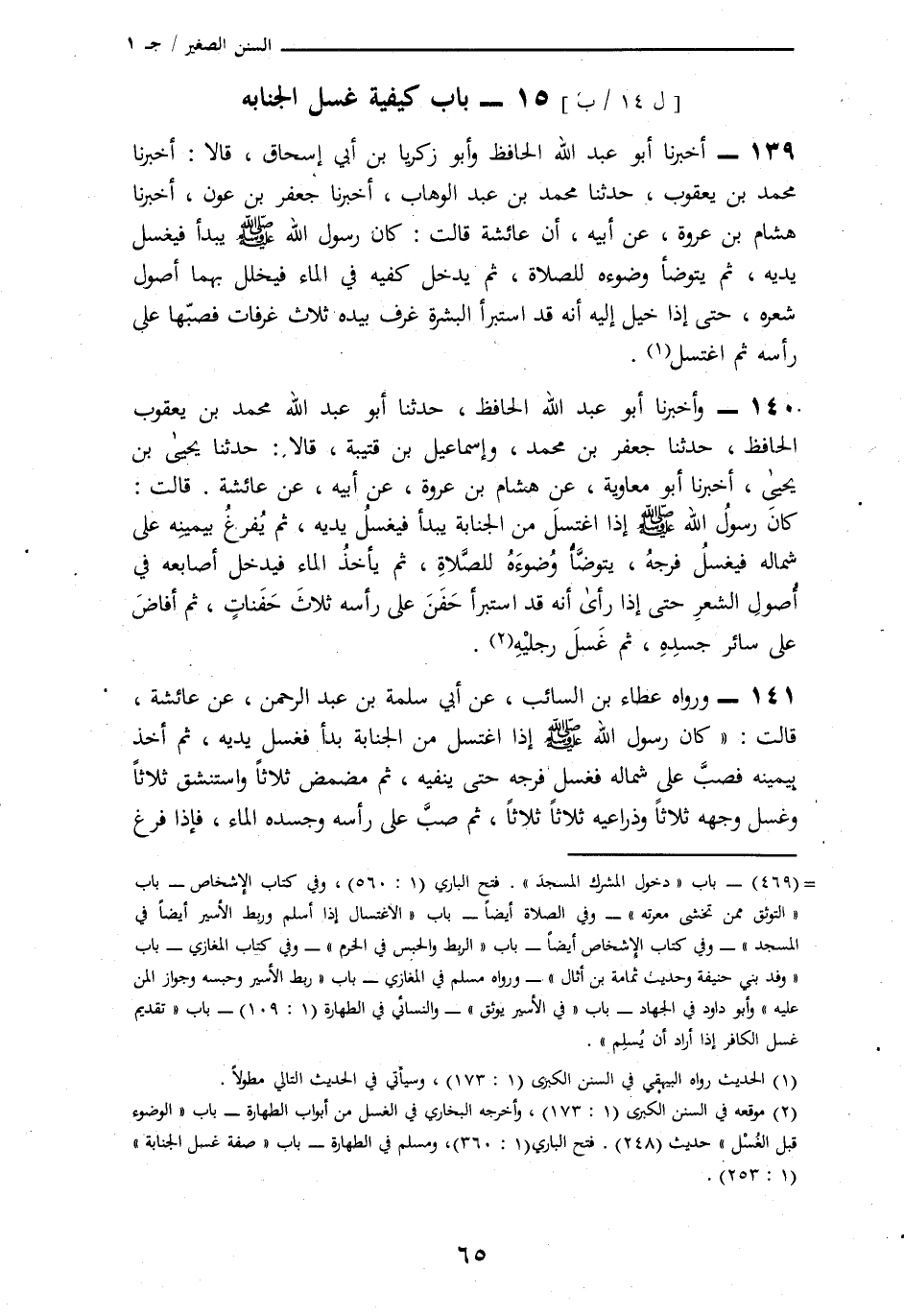140 - وَأَخْبَرَنَا أَبُو عَبْدِ اللَّهِ الْحَافِظُ، نا أَبُو عَبْدِ اللَّهِ مُحَمَّدُ بْنُ يَعْقُوبَ الْحَافِظُ، نا جَعْفَرُ بْنُ مُحَمَّدٍ، وَإِسْمَاعِيلُ بْنُ قُتَيْبَةَ، قَالَا: نا يَحْيَى بْنُ يَحْيَى، أنا أَبُو مُعَاوِيَةَ، عَنْ هِشَامِ بْنِ عُرْوَةَ، عَنْ أَبِيهِ، عَنْ عَائِشَةَ، قَالَتْ: § «كَانَ رَسُولُ اللَّهِ صَلَّى اللهُ عَلَيْهِ وَسَلَّمَ إِذَا اغْتَسَلَ مِنَ الْجَنَابَةِ يَبْدَأُ فَيَغْسِلُ يَدَيْهِ، ثُمَّ يُفْرِغُ بِيَمِينِهِ عَلَى شِمَالِهِ فَيَغْسِلُ فَرْجَهُ، ثُمَّ يَتَوَضَّأُ وُضُوءَهُ لِلصَّلَاةِ ثُمَّ يَأْخُذُ الْمَاءَ فَيُدْخِلُ أَصَابِعَهُ فِي أُصُولِ الشَّعْرِ حَتَّى إِذَا رَأَى أَنَّهُ قَدِ اسْتَبْرَأَ حَفَنَ عَلَى رَأْسِهِ ثَلَاثَ حَفَنَاتٍ ثُمَّ أَفَاضَ عَلَى سَائِرِ جَسَدِهِ ثُمَّ غَسَلَ رِجْلَيْهِ»
