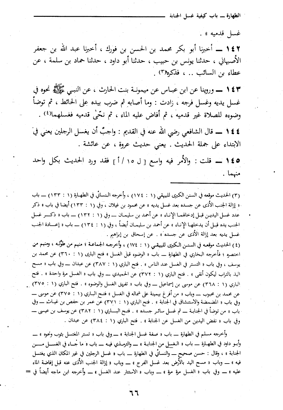 143 - وَرُوِّينَا عَنِ ابْنِ عَبَّاسٍ، عَنْ مَيْمُونَةَ بِنْتِ الْحَارِثِ، عَنِ النَّبِيِّ صَلَّى اللهُ عَلَيْهِ وَسَلَّمَ نَحْوَهُ فِي غُسْلِ يَدَيْهِ وَغُسْلِ فَرْجِهِ، زَادَتْ: §" وَمَا أَصَابَهُ ثُمَّ ضَرَبَ بِيَدِهِ عَلَى الْحَائِطِ ثُمَّ تَوَضَّأَ وُضُوءَهُ لِلصَّلَاةِ غَيْرَ قَدَمَيْهِ ثُمَّ أَفَاضَ عَلَيْهِ الْمَاءَ ثُمَّ نَحَّى قَدَمَيْهِ فَغَسَلَهُمَا