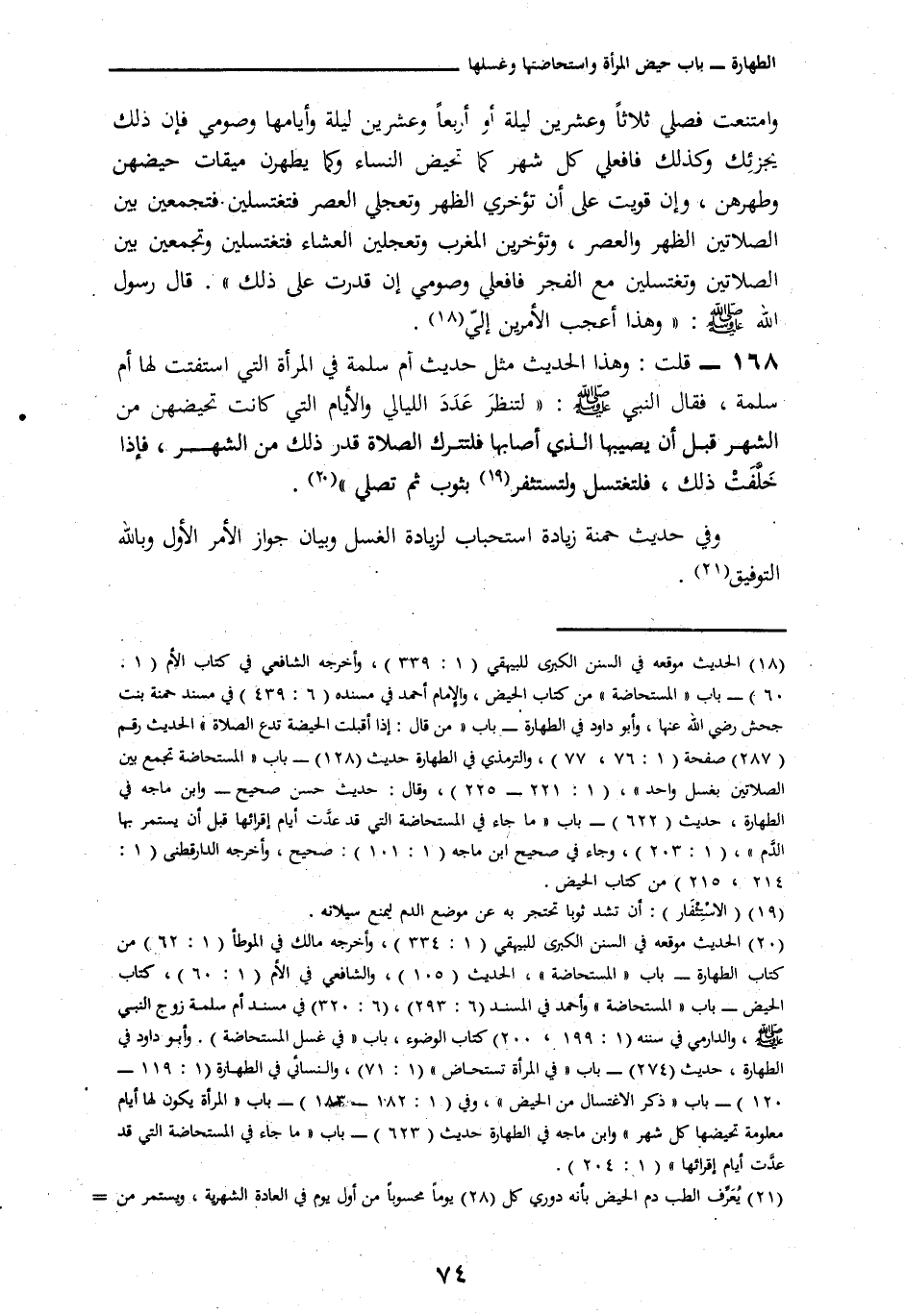 168 - قُلْتُ: وَهَذَا مِثْلُ حَدِيثِ أُمِّ سَلَمَةَ فِي الْمَرْأَةِ الَّتِي اسْتَفْتَتْ لَهَا أُمُّ سَلَمَةَ فَقَالَ النَّبِيُّ صَلَّى اللهُ عَلَيْهِ وَسَلَّمَ: § «لِتَنْظُرْ عَدَدَ اللَّيَالِي وَالْأَيَّامِ الَّتِي كَانَتْ تَحِيضُهُنَّ مِنَ الشَّهْرِ قَبْلَ أَنْ يُصِيبَهَا الَّذِي أَصَابَهَا فَلْتَتْرُكِ الصَّلَاةَ قَدْرَ ذَلِكَ مِنَ الشَّهْرِ فَإِذَا خَلَّفَتْ ذَلِكَ فَلْتَغْتَسِلْ وَلْتَسْتَثْفِرْ بِثَوْبٍ ثُمَّ لِتُصَلِّي» وَفِي حَدِيثِ حَمْنَةَ زِيَادَةُ اسْتِحْبَابٍ لِزِيَادَةِ الْغُسْلِ وَبَيَانُ جَوَازِ الْأَمْرِ الْأَوَّلِ وَبِاللَّهِ التَّوْفِيقُ -[74]-