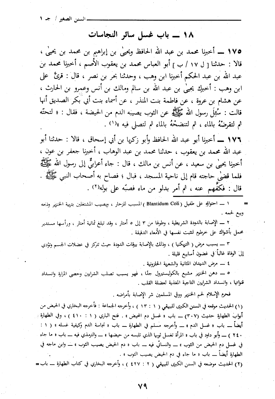 176 - أَخْبَرَنَا أَبُو عَبْدِ اللَّهِ الْحَافِظُ، وَأَبُو زَكَرِيَّا بْنُ أَبِي إِسْحَاقَ قَالَا: نا أَبُو عَبْدِ اللَّهِ مُحَمَّدُ بْنُ يَعْقُوبَ، نا مُحَمَّدُ بْنُ عَبْدِ الْوَهَّابِ، أنا جَعْفَرُ بْنُ عَوْنٍ، أنا يَحْيَى بْنُ سَعِيدٍ، عَنْ أَنَسِ بْنِ مَالِكِ، قَالَ: جَاءَ أَعْرَابِيٌّ إِلَى رَسُولِ اللَّهِ صَلَّى اللهُ عَلَيْهِ وَسَلَّمَ فَلَمَّا قَضَى حَاجَتَهُ قَامَ إِلَى نَاحِيَةِ الْمَسْجِدِ فَبَالَ فَصَاحَ بِهِ أَصْحَابُ النَّبِيِّ صَلَّى اللهُ عَلَيْهِ وَسَلَّمَ قَالَ: § «فَكَفَّهُمْ عَنْهُ ثُمَّ أَمَرَ بِدَلْو مِنْ مَاءٍ فَصَبَّهُ عَلَى بَوْلِهِ -[78]-. فَوَجَبَ بِهَذَيْنِ الْحَدِيثَيْنِ إِزَالَةُ النَّجَاسَاتِ بِالْمَاءِ»