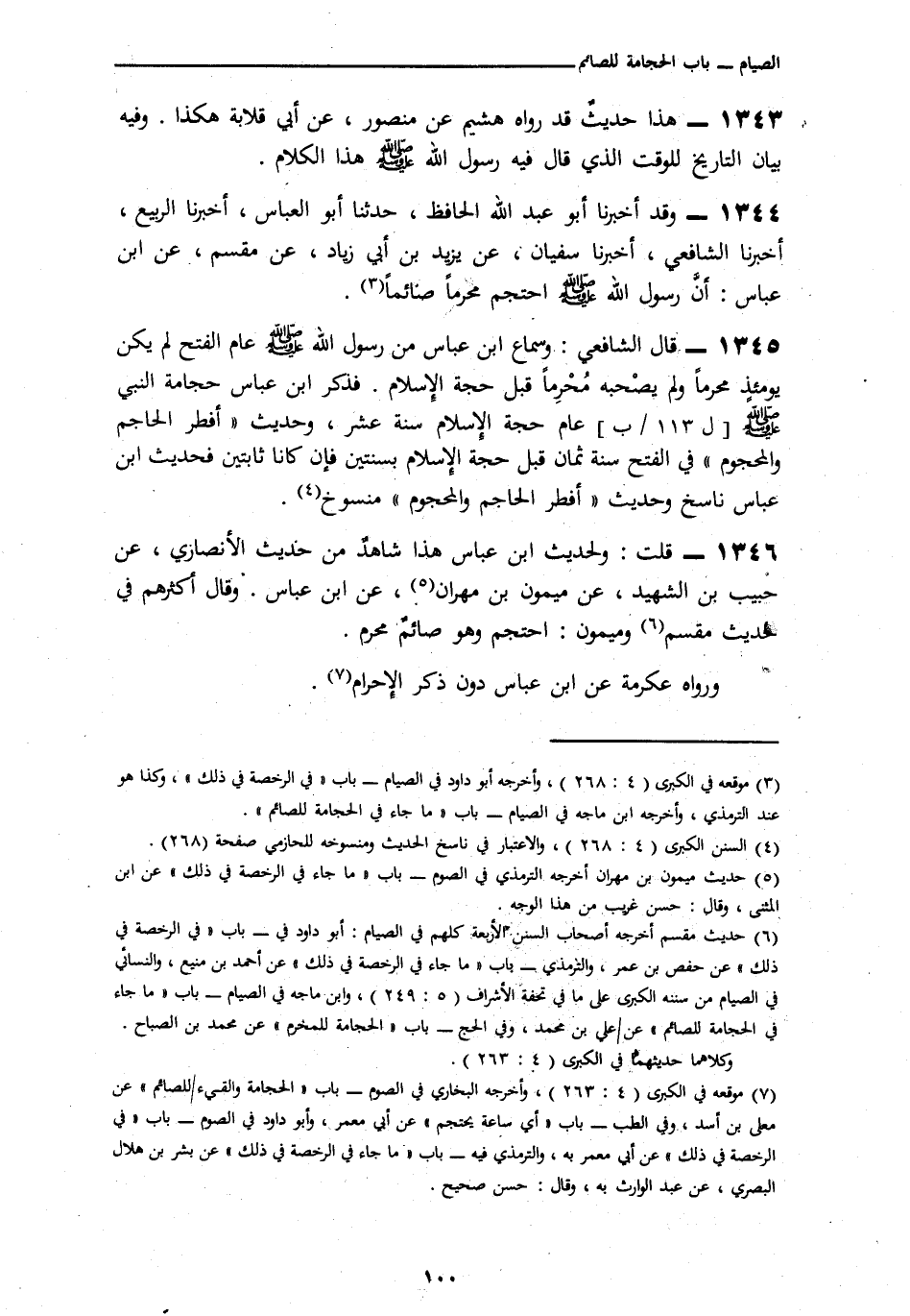 1345 - قَالَ الشَّافِعِيُّ: وَسَمَاعُ ابْنِ عَبَّاسٍ مِنْ رَسُولِ اللَّهِ صَلَّى اللهُ عَلَيْهِ وَسَلَّمَ، عَامَ الْفَتْحِ لَمْ يَكُنْ يَوْمَئِذٍ مُحْرِمًا وَلَمْ يَصْحَبْهُ مُحْرِمًا قَبْلَ حَجَّةِ الْإِسْلَامِ فَذَكَرَ ابْنُ عَبَّاسٍ حِجَامَةَ النَّبِيِّ صَلَّى اللهُ عَلَيْهِ وَسَلَّمَ، عَامَ حَجَّةِ الْإِسْلَامِ سَنَةَ عَشْرٍ، وَحَدِيثُ «أَفْطَرَ الْحَاجِمُ، وَالْمَحْجُومُ» سَنَةَ ثَمَانٍ قَبْلَ حَجَّةِ الْإِسْلَامِ بِسَنَتَيْنِ، فَإِنْ كَانَا ثَابِتَيْنِ فَحَدِيثُ ابْنِ عَبَّاسٍ نَاسِخٌ وَحَدِيثُ «أَفْطَرَ الْحَاجِمُ وَالْمَحْجُومُ» مَنْسُوخٌ
