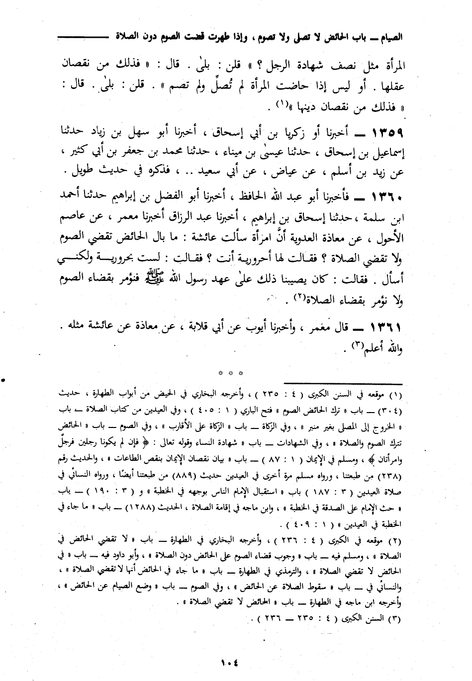1360 - وَأَخْبَرَنَا أَبُو عَبْدِ اللَّهِ الْحَافِظُ، أَنَا أَبُو الْفَضْلِ بْنُ إِبْرَاهِيمَ، نَا أَحْمَدُ بْنُ سَلَمَةَ، نَا إِسْحَاقُ بْنُ إِبْرَاهِيمَ، أَنَا عَبْدُ الرَّزَّاقِ، أَنَا مَعْمَرٌ، عَنْ عَاصِمٍ الْأَحْوَلِ، عَنْ مُعَاذَةَ الْعَدَوِيَّةِ، أَنَّ امْرَأَةً، سَأَلَتْ عَائِشَةَ: مَا بَالُ الْحَائِضِ تَقْضِي الصَّوْمَ وَلَا تَقْضِي الصَّلَاةَ؟ فَقَالَتْ لَهَا: أَحَرُورِيَّةٌ أَنْتِ؟ فَقَالَتْ: لَسْتُ بِحَرُورِيَّةٍ وَلَكِنِّي أَسْأَلُ، فَقَالَتْ: «كَانَ يُصِيبُنَا ذَلِكَ عَلَى عَهْدِ رَسُولِ اللَّهِ صَلَّى اللهُ عَلَيْهِ وَسَلَّمَ، §فَنُؤْمَرُ بِقَضَاءِ الصَّوْمِ وَلَا نُؤْمَرُ بِقَضَاءِ الصَّلَاةِ»