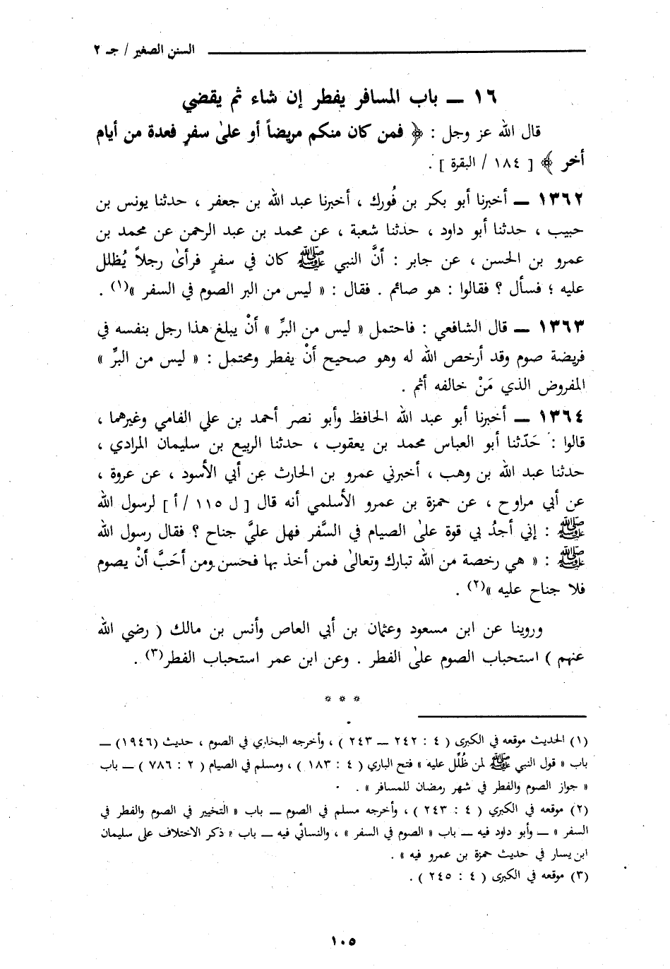 1364 - وَرُوِّينَا عَنِ ابْنِ مَسْعُودٍ، وَعُثْمَانَ بْنِ أَبِي الْعَاصِ، وَأَنَسِ بْنِ مَالِكٍ رَضِيَ اللَّهُ عَنْهُمْ: «§اسْتِحْبَابُ الصَّوْمِ عَلَى الْفِطْرِ» وَعَنِ ابْنِ عُمَرَ: «اسْتِحْبَابُ الْفِطْرِ»