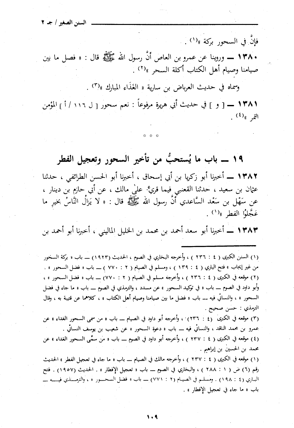 1380 - وَرُوِّينَا عَنْ عَمْرِو بْنِ الْعَاصِ، أَنَّ رَسُولَ اللَّهِ صَلَّى اللهُ عَلَيْهِ وَسَلَّمَ قَالَ: § «فَصْلُ مَا بَيْنَ صِيَامِنَا وَصِيَامِ أَهْلِ الْكِتَابِ أَكْلَةُ السَّحُورُ» وَمَعْنَاهُ فِي حَدِيثِ الْعِرْبَاضِ بْنِ سَارِيَةَ الْغِدَاءُ الْمُبَارَكُ