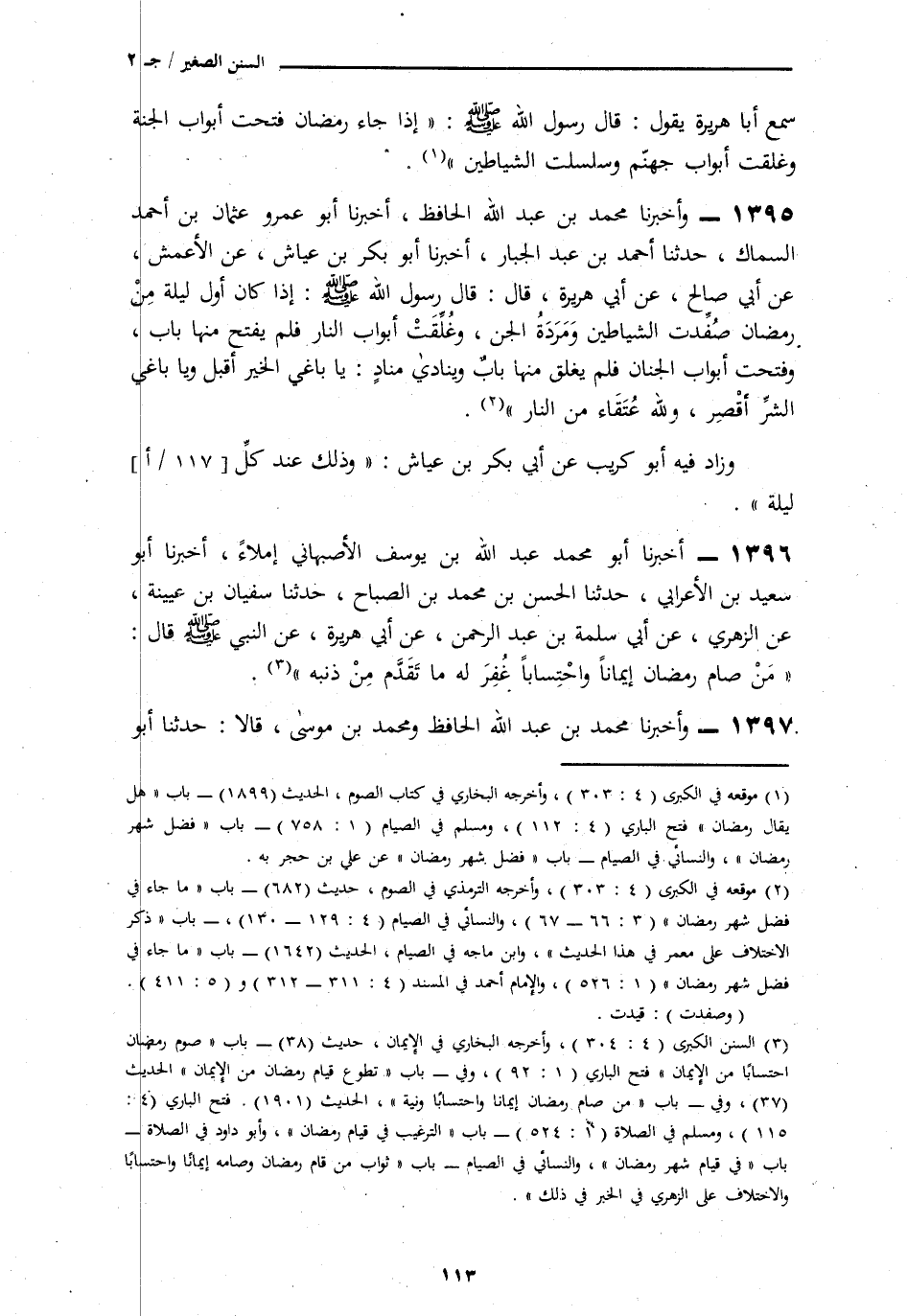 1395 - أَخْبَرَنَا مُحَمَّدُ بْنُ عَبْدِ اللَّهِ الْحَافِظُ، أَنَا أَبُو عَمْرٍو عُثْمَانُ بْنُ أَحْمَدَ بْنِ السَّمَّاكِ، نَا أَحْمَدُ بْنُ عَبْدِ الْجَبَّارِ، أَنَا أَبُو بَكْرِ بْنُ عَيَّاشٍ، عَنِ الْأَعْمَشِ، عَنْ أَبِي صَالِحٍ، عَنْ أَبِي هُرَيْرَةَ، قَالَ: قَالَ رَسُولُ اللَّهِ صَلَّى اللهُ عَلَيْهِ وَسَلَّمَ: §" إِذَا كَانَ أَوَّلُ لَيْلَةٍ مِنْ رَمَضَانَ صُفِّدَتِ الشَّيَاطِينُ وَمَرَدَةُ الْجِنِّ، وَغُلِّقَتْ أَبْوَابُ النَّارِ فَلَمْ يُفْتَحْ مِنْهَا بَابٌ، وَفُتِحَتْ أَبْوَابُ الْجِنَانِ فَلَا يُغْلَقْ مِنْهَا بَابٌ وَنَادَى مُنَادٍ: يَا بَاغِيَ الْخَيْرِ أَقْبِلْ، وَيَا بَاغِيَ الشَّرِّ أَقْصِرْ، وَلِلَّهِ عُتَقَاءُ مِنَ النَّارِ " زَادَ فِيهِ أَبُو كُرَيْبٍ، عَنْ أَبِي بَكْرِ بْنِ عَيَّاشٍ: وَذَلِكَ عِنْدَ كُلِّ لَيْلَةٍ