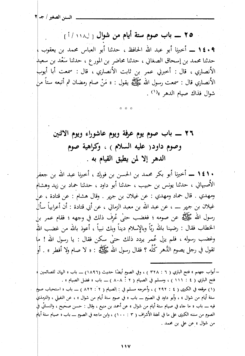 1410 - أَخْبَرَنَا أَبُو بَكْرٍ مُحَمَّدُ بْنُ الْحَسَنِ بْنِ فُورَكٍ، أَنَا عَبْدُ اللَّهِ بْنُ جَعْفَرٍ الْأَصْبَهَانِيُّ، نَا يُونُسُ بْنُ حَبِيبٍ، نَا أَبُو دَاوُدَ، نَا حَمَّادُ بْنُ زَيْدٍ، وَهِشَامٌ، وَمَهْدِيٌّ، قَالَ حَمَّادٌ، ومَهْدِيٌّ: عَنْ غَيْلَانَ بْنِ جَرِيرٍ، وَقَالَ هِشَامٌ: عَنْ قَتَادَةَ،: عَنْ غَيْلَانَ بْنِ جَرِيرٍ، عَنْ عَبْدِ اللَّهِ بْنِ مَعْبَدٍ الزِّمَّانِيِّ، عَنْ أَبِي قَتَادَةَ: أَنَّ أَعْرَابِيًّا، سَأَلَ رَسُولَ اللَّهِ صَلَّى اللهُ عَلَيْهِ وَسَلَّمَ، عَنْ صَوْمِهِ؟ فَغَضِبَ حَتَّى عُرِفَ ذَلِكَ فِي وَجْهِهِ؛ فَقَامَ عُمَرُ بْنُ الْخَطَّابِ فَقَالَ: رَضِينَا بِاللَّهِ رَبًّا وَبِالْإِسْلَامِ دَيْنًا وَبِكَ نَبِيًّا، أَعُوذُ بِاللَّهِ مِنْ غَضَبِ اللَّهِ وَغَضَبِ رَسُولِهِ، فَلَمْ يَزَلْ عُمَرُ يُرَدِّدُ ذَلِكَ حَتَّى سَكَنَ فَقَالَ: يَا رَسُولَ اللَّهِ، مَا تَقُولُ فِي رَجُلٍ يَصُومُ الدَّهْرَ كُلَّهُ؟ فَقَالَ رَسُولُ اللَّهِ صَلَّى اللهُ عَلَيْهِ وَسَلَّمَ: «لَا صَامَ وَلَا أَفْطَرَ» أَوْ -[118]- قَالَ: «مَا صَامَ وَمَا أَفْطَرَ» فَقَالَ: يَا رَسُولَ اللَّهِ كَيْفَ بِمَنْ يَصُومُ يَوْمَيْنِ وَيُفْطِرُ يَوْمًا؟ فَقَالَ: «وَمَنْ يُطِيقُ ذَلِكَ» فَقَالَ: يَا رَسُولَ اللَّهِ كَيْفَ بِمَنْ يُفْطِرُ يَوْمَيْنِ وَيَصُومُ يَوْمًا؟ فَقَالَ: «لَوَدِدْتُ أَنِّي طُوِّقْتُ ذَلِكَ» فَقَالَ: يَا رَسُولَ اللَّهِ فَمَا تَقُولُ فِي صَوْمِ يَوْمِ الِاثْنَيْنِ؟ فَقَالَ: «ذَلِكَ يَوْمٌ وُلِدْتُ فِيهِ وَأُنْزِلَ عَلَيَّ فِيهِ» فَقَالَ: يَا رَسُولَ اللَّهِ فَمَا تَقُولُ فِيمَنْ يَصُومُ يَوْمًا وَيُفْطِرُ يَوْمًا؟ فَقَالَ: «ذَلِكَ صَوْمُ أَخِي دَاوُدَ صَلَوَاتُ اللَّهِ عَلَيْهِ» قَالَ: يَا رَسُولَ اللَّهِ فَمَا تَقُولُ فِي صَوْمِ يَوْمِ عَاشُورَاءَ؟ قَالَ: «إِنِّي لَأَحْتَسِبُ عَلَى اللَّهِ عَزَّ وَجَلَّ أَنْ يُكَفِّرَ السَّنَةَ» قَالَ: يَا رَسُولَ اللَّهِ فَمَا تَقُولُ فِي صَوْمِ يَوْمِ عَرَفَةَ؟ قَالَ: § «إِنِّي لَأَحْتَسِبُ عَلَى اللَّهِ أَنْ يُكَفِّرَ السَّنَةَ الَّتِي قَبْلَهَا وَالسَّنَةَ الَّتِي بَعْدَهَا»