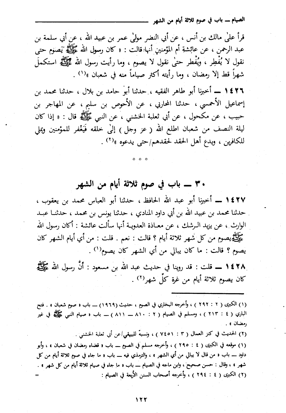 1428 - قُلْتُ: قَدْ رُوِّينَا فِي حَدِيثِ عَبْدِ اللَّهِ بْنِ مَسْعُودٍ: أَنَّ رَسُولَ اللَّهِ صَلَّى اللهُ عَلَيْهِ وَسَلَّمَ: «كَانَ §يَصُومُ ثَلَاثَةَ أَيَّامٍ مِنْ غُرَّةِ كُلِّ شَهْرٍ»