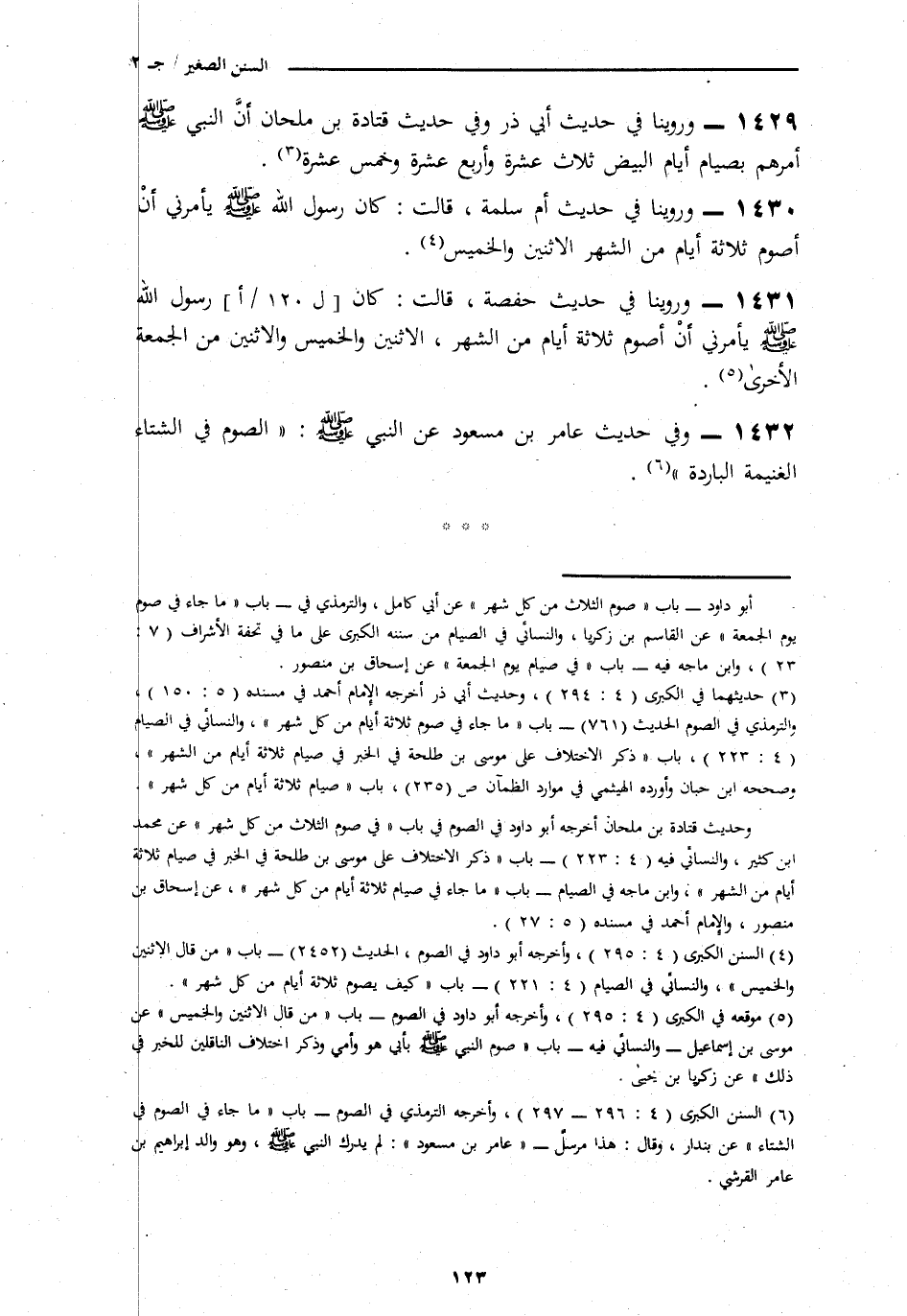 1431 - وَرُوِّينَا فِي، حَدِيثِ حَفْصَةَ قَالَتْ: كَانَ رَسُولُ اللَّهِ صَلَّى اللهُ عَلَيْهِ وَسَلَّمَ: «§يَصُومَ ثَلَاثَةَ أَيَّامٍ مِنَ الشَّهْرِ، الْإِثْنَيْنِ، وَالْخَمِيسَ، وَالْإِثْنَيْنِ مِنَ الْجُمُعَةِ الْأُخْرَى»
