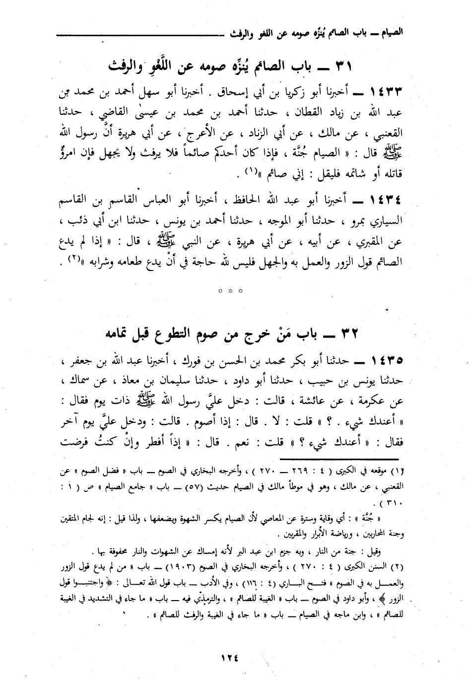 1433 - أَخْبَرَنَا أَبُو زَكَرِيَّا بْنُ أَبِي إِسْحَاقَ، أَنَا أَبُو سَهْلٍ أَحْمَدُ بْنُ مُحَمَّدِ بْنِ عَبْدِ اللَّهِ بْنِ زِيَادٍ الْقَطَّانُ، نَا أَحْمَدُ بْنُ مُحَمَّدِ بْنِ عِيسَى الْقَاضِي، نَا الْقَعْنَبِيُّ، عَنْ مَالِكٍ، عَنْ أَبِي الزِّنَادِ، عَنِ الْأَعْرَجِ، عَنْ أَبِي هُرَيْرَةَ، أَنَّ رَسُولَ اللَّهِ صَلَّى اللهُ عَلَيْهِ وَسَلَّمَ قَالَ: §" الصِّيَامُ جُنَّةٌ، فَإِذَا كَانَ أَحَدُكُمْ صَائِمًا فَلَا يَرْفُثْ، وَلَا يَجْهَلْ فَإِنِ امْرُؤٌ قَاتَلَهُ، أَوْ شَاتَمَهُ فَلْيَقُلْ: إِنِّي صَائِمٌ "