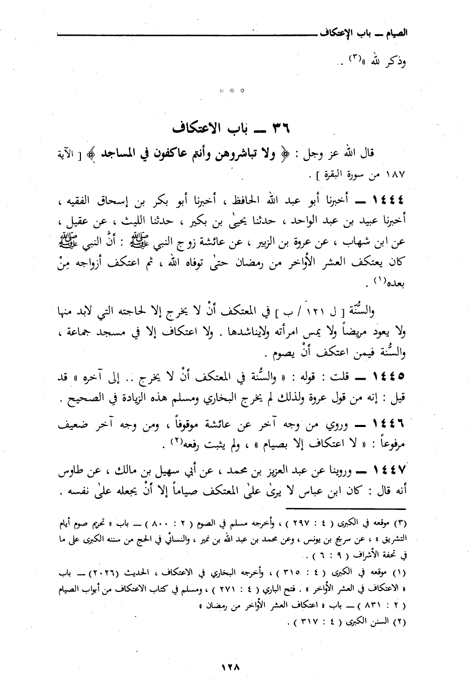 1444 - أَخْبَرَنَا أَبُو عَبْدِ اللَّهِ الْحَافِظُ، أَنَا أَبُو بَكْرِ بْنُ إِسْحَاقَ الْفَقِيهُ، أَنَا عُبَيْدُ بْنُ عَبْدِ الْوَاحِدِ، نَا يَحْيَى بْنُ بُكَيْرٍ، نَا اللَّيْثُ، عَنْ عَقِيلٍ، عَنِ ابْنِ شِهَابٍ، عَنْ عُرْوَةَ بْنِ الزُّبَيْرِ، عَنْ عَائِشَةَ، زَوْجِ النَّبِيِّ صَلَّى اللهُ عَلَيْهِ وَسَلَّمَ: أَنَّ النَّبِيَّ صَلَّى اللهُ عَلَيْهِ وَسَلَّمَ: «كَانَ §يَعْتَكِفُ الْعَشْرَ الْأَوَاخِرَ مِنْ رَمَضَانَ، حَتَّى تَوَفَّاهُ اللَّهُ، ثُمَّ اعْتَكَفَ أَزْوَاجُهُ مِنْ بَعْدِهِ، وَالسُّنَّةُ فِي الْمُعْتَكِفِ أَنْ لَا يَخْرُجَ إِلَّا لِحَاجَتِهِ الَّتِي لَابُدَّ لَهُ مِنْهَا، وَلَا يَعُودَ مَرِيضًا، وَلَا يَمَسَّ امْرَأَتَهُ وَلَا يُبَاشِرهَا، وَلَا اعْتِكَافَ إِلَّا فِي مَسْجِدِ جَمَاعَةٍ، وَالسُّنَّةُ فِيمَنِ اعْتَكَفَ أَنْ يَصُومَ»