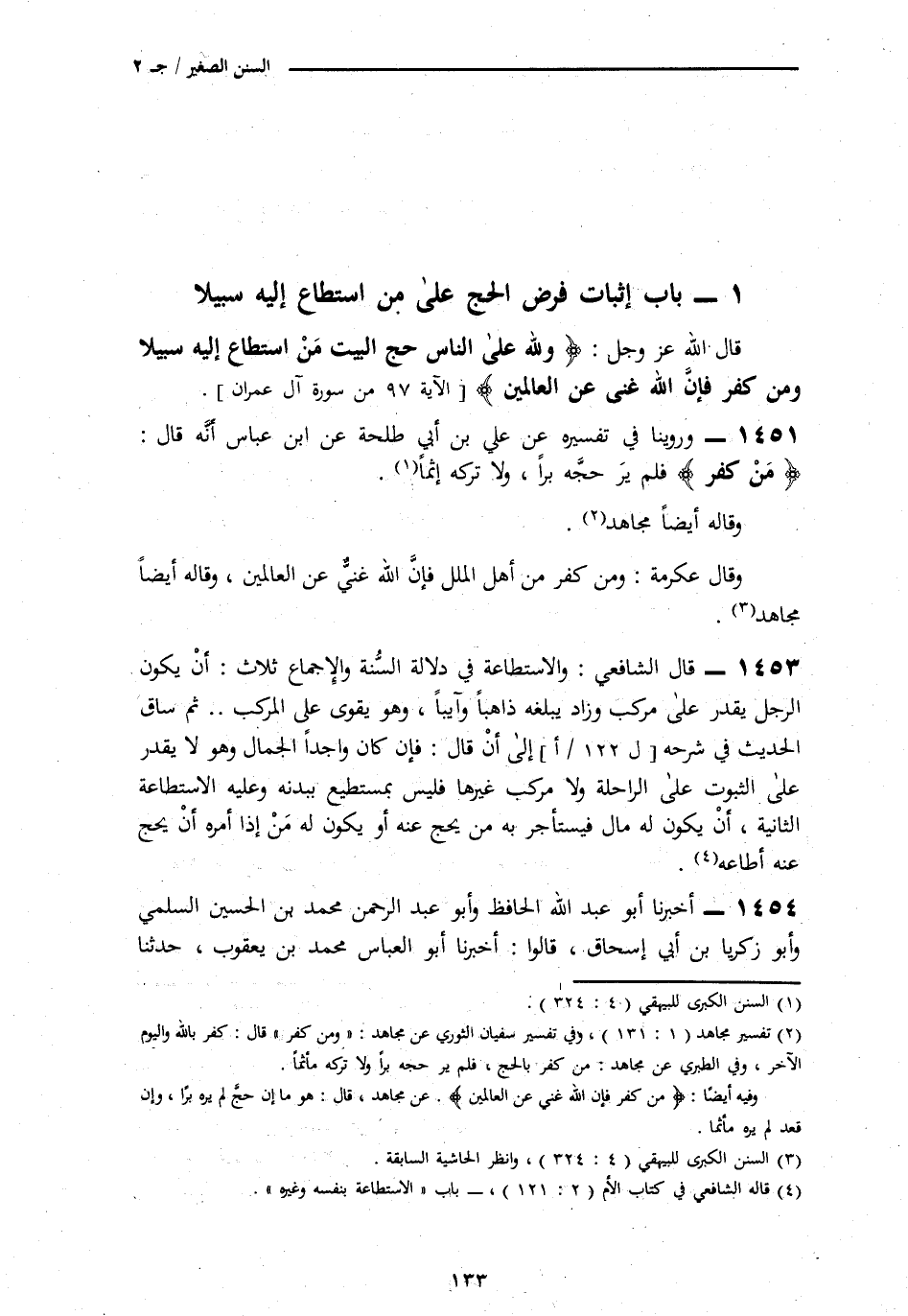 1451 - وَرُوِّينَا فِي تَفْسِيرِهِ عَنْ عَلِيِّ بْنِ أَبِي طَلْحَةَ، عَنِ ابْنِ عَبَّاسٍ، أَنَّهُ " قَالَ: {§مَنْ كَفَرَ} [البقرة: 253] فَلَمْ يَرَ حَجَّهُ بِرًّا، وَلَا تَرْكَهُ إِثْمًا " وَقَالَهُ أَيْضًا مُجَاهِدٌ