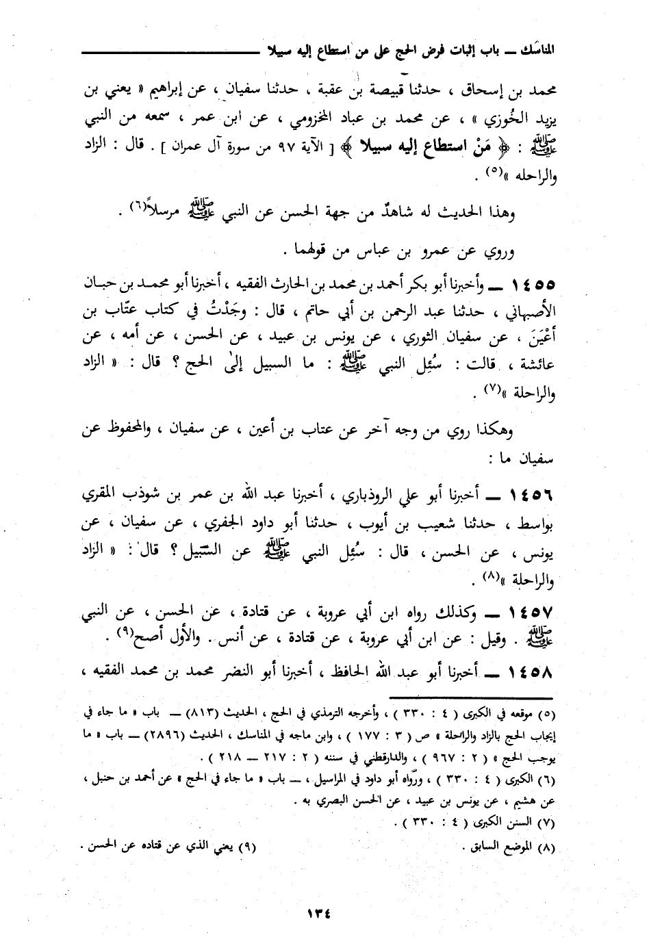 1456 - أَخْبَرَنَا أَبُو عَلِيٍّ الرُّوذْبَارِيُّ، أَنَا عَبْدُ اللَّهِ بْنُ عُمَرَ بْنِ شَوْذَبٍ الْمُقْرِي بِوَاسِطَ، نَا شُعَيْبُ بْنُ أَيُّوبَ، نَا أَبُو دَاوُدَ الْحَفَرِيُّ، عَنْ سُفْيَانَ، عَنْ يُونُسَ، عَنِ الْحَسَنِ، قَالَ: سُئِلَ النَّبِيُّ صَلَّى اللهُ عَلَيْهِ وَسَلَّمَ، عَنِ السَّبِيلِ؟ قَالَ: «§الزَّادُ، وَالرَّاحِلَةُ»