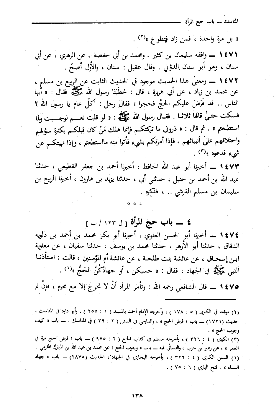 1472 - وَمَعْنَى هَذَا الْحَدِيثِ مَوْجُودٌ فِي الْحَدِيثِ الثَّابِتِ عَنِ الرَّبِيعِ بْنِ مُسْلِمٍ، عَنْ مُحَمَّدِ بْنِ زِيَادٍ، عَنْ أَبِي هُرَيْرَةَ قَالَ: خَطَبَنَا رَسُولُ اللَّهِ صَلَّى اللهُ عَلَيْهِ وَسَلَّمَ فَقَالَ: «أَيُّهَا النَّاسُ، قَدْ فُرِضَ عَلَيْكُمُ الْحَجُّ فَحُجُّوا» فَقَالَ رَجُلٌ: أَكُلَّ عَامٍ يَا رَسُولَ اللَّهِ؟ فَسَكَتَ حَتَّى قَالَهَا ثَلَاثًا، فَقَالَ رَسُولُ اللَّهِ صَلَّى اللهُ عَلَيْهِ وَسَلَّمَ: «لَوْ قُلْتُ نَعَمْ لَوَجَبَتْ وَلَمَا اسْتَطَعْتُمْ» ثُمَّ قَالَ: § «ذَرُونِي مَا تَرَكْتُكُمْ فَإِنَّمَا هَلَكَ مَنْ كَانَ قَبْلَكُمْ بِكَثْرَةِ سُؤَالِهِمْ، وَاخْتِلَافِهِمْ عَلَى أَنْبِيَائِهِمْ، فَإِذَا أَمَرْتُكُمْ بِشَيْءٍ فَأْتُوا مِنْهُ مَا اسْتَطَعْتُمْ، وَإِذَا نَهَيْتُكُمْ عَنْ شَيْءٍ فَدَعُوهُ»