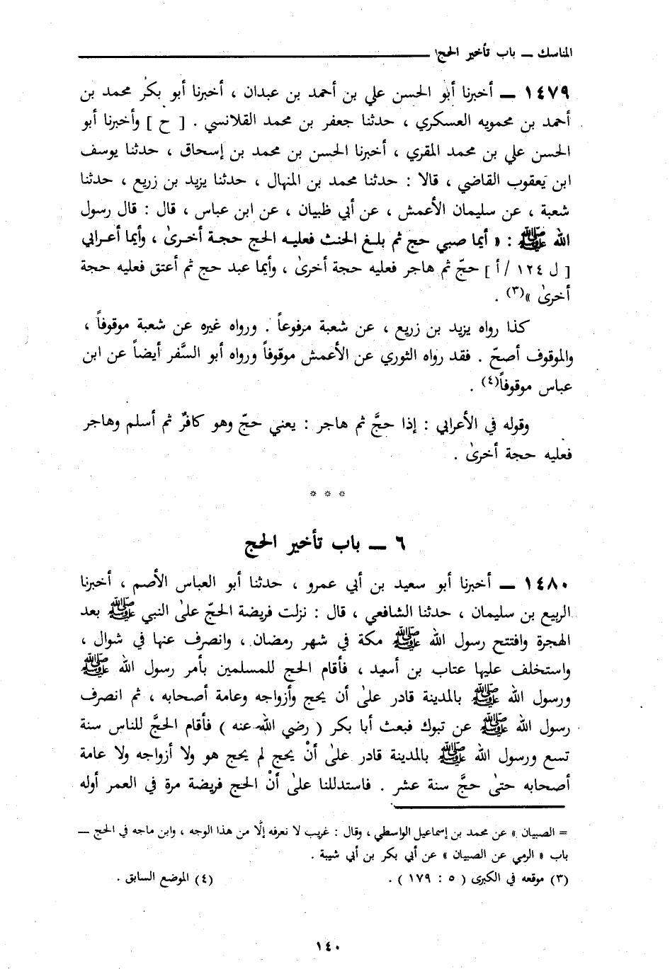 1479 - أَخْبَرَنَا أَبُو الْحَسَنِ عَلِيُّ بْنُ أَحْمَدَ بْنِ عَبْدَانَ، أَنَا أَبُو بَكْرٍ مُحَمَّدُ بْنُ أَحْمَدَ بْنِ مَحْمَوَيْهِ الْعَسْكَرِيُّ، نَا جَعْفَرُ بْنُ مُحَمَّدٍ الْقَلَانِسِيُّ، وَأَخْبَرَنَا أَبُو الْحَسَنِ عَلِيُّ بْنُ مُحَمَّدٍ الْمُقْرِئُ، أَنَا الْحَسَنُ بْنُ مُحَمَّدِ بْنِ إِسْحَاقَ، ثَنَا يُوسُفُ بْنُ يَعْقُوبَ، قَالَا: نَا مُحَمَّدُ بْنُ الْمِنْهَالِ، نَا يَزِيدُ بْنُ زُرَيْعٍ، نَا شُعْبَةُ، عَنْ سُلَيْمَانَ الْأَعْمَشِ، عَنْ أَبِي ظَبْيَانَ، عَنِ ابْنِ عَبَّاسٍ، قَالَ: قَالَ رَسُولُ اللَّهِ صَلَّى اللهُ عَلَيْهِ وَسَلَّمَ: § «أَيُّمَا صَبِيٍّ حَجَّ ثُمَّ بَلَغَ الْحِنْثَ فَعَلَيْهِ أنْ يَحُجُّ حَجَّةً أُخْرَى، وَأَيُّمَا أَعْرَابِيٍّ حَجَّ ثُمَّ هَاجَرَ فَعَلَيْهِ أَنْ يَحُجَّ حَجَّةً أُخْرَى، وَأَيُّمَا عَبْدٍ حَجِّ ثُمَّ أُعْتِقَ فَعَلَيْهِ حَجَّةٌ أُخْرَى» كَذَا رَوَاهُ يَزِيدُ بْنُ زُرَيْعٍ، عَنْ شُعْبَةَ مَرْفُوعًا، وَرَوَاهُ غَيْرُهُ عَنْ شُعْبَةَ، مَوْقُوفًا، وَالْمَوْقُوفُ أَصَحُّ، وَقَدْ رَوَاهُ الثَّوْرِيُّ عَنِ الْأَعْمَشِ، مَوْقُوفًا وَرَوَاهُ أَبُو السَّفَرِ أَيْضًا، عَنِ ابْنِ عَبَّاسٍ، مَوْقُوفًا وَقَوْلُهُ فِي الْأَعْرَابِيِّ: إِذَا حَجَّ ثُمَّ هَاجَرَ: يَعْنِي حَجَّ وَهُوَ كَافِرٌ، ثُمَّ أَسْلَمَ وَهَاجَرَ فَعَلَيْهِ حَجَّةٌ أُخْرَى