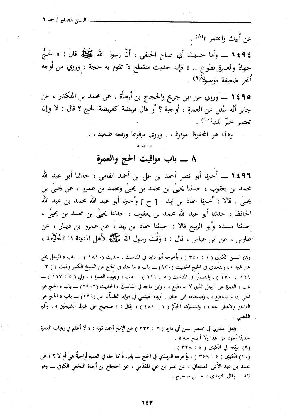 1494 - وَأَمَّا حَدِيثُ أَبِي صَالِحٍ الْحَنَفِيِّ، أَنَّ رَسُولَ اللَّهِ صَلَّى اللهُ عَلَيْهِ وَسَلَّمَ قَالَ: «§الْحَجُّ جِهَادٌ، وَالْعُمْرَةُ تَطَوُّعٌ» فَإِنَّهُ حَدِيثٌ مُنْقَطِعٌ لَا تَقُومُ بِهِ حُجَّةٌ، وَرُوِي مِنْ أَوْجُهِ أُخَرَ ضَعِيفَةٍ مَوْصُولًا
