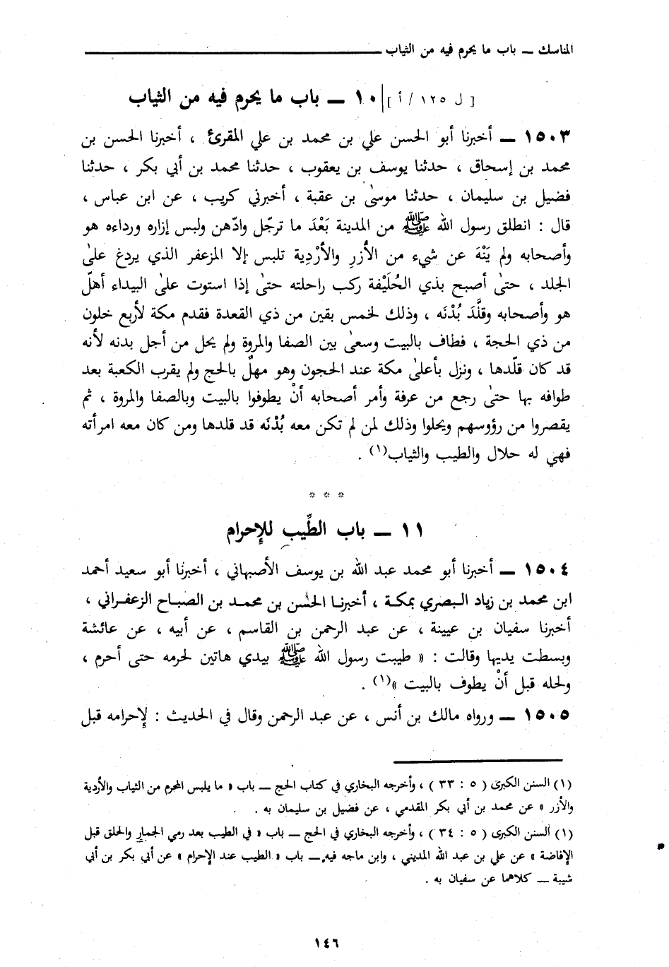 1504 - حَدَّثَنَا أَبُو مُحَمَّدٍ عَبْدُ اللَّهِ بْنُ يُوسُفَ الْأَصْبَهَانِيُّ، أَنَا أَبُو سَعِيدٍ أَحْمَدُ بْنُ مُحَمَّدِ بْنِ زِيَادٍ الْبَصْرِيُّ بِمَكَّةَ، أَنَا الْحَسَنُ بْنُ مُحَمَّدِ بْنِ الصَّبَّاحِ الزَّعْفَرَانِيُّ، أَنَا سُفْيَانُ بْنُ عُيَيْنَةَ، عَنْ عَبْدِ الرَّحْمَنِ بْنِ الْقَاسِمِ، عَنْ أَبِيهِ، عَنْ عَائِشَةَ، وَبَسَطَتْ، يَدَيْهَا وَقَالَتْ: «§طَيَّبْتُ رَسُولَ اللَّهِ صَلَّى اللهُ عَلَيْهِ وَسَلَّمَ، بِيَدِيَّ هَاتَيْنِ لِحَرَمِهِ حِينَ أَحْرَمَ، وَلِحِلِّهِ قَبْلَ أَنْ يَطُوفَ بِالْبَيْتِ»