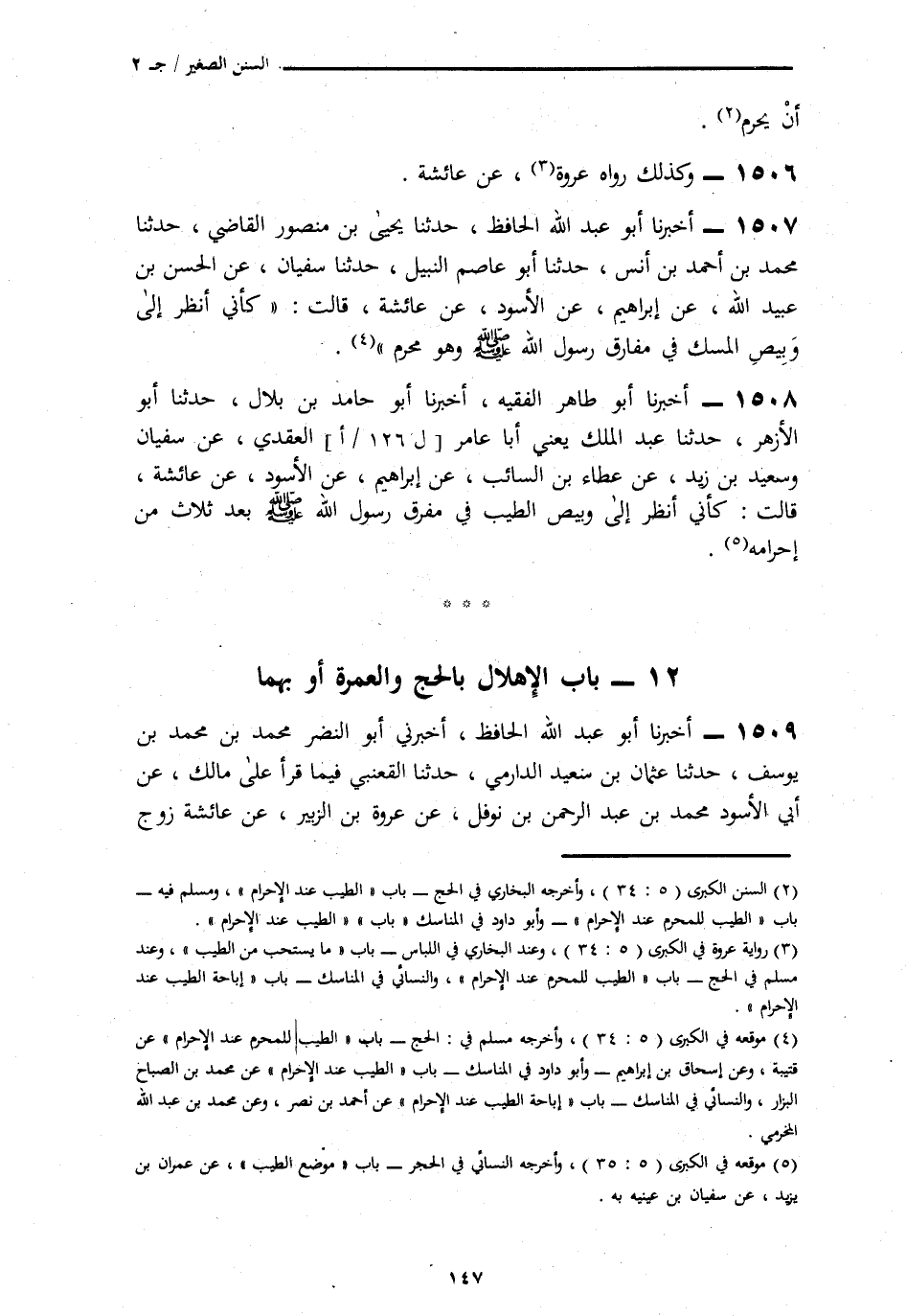 1507 - أَخْبَرَنَا أَبُو عَبْدِ اللَّهِ الْحَافِظُ، نا يَحْيَى بْنُ مَنْصُورٍ الْقَاضِي، نَا مُحَمَّدُ بْنُ أَحْمَدَ بْنِ أَنَسٍ، نَا أَبُو عَاصِمٍ النَّبِيلُ، نَا سُفْيَانُ، عَنِ الْحَسَنِ بْنِ عُبَيْدِ اللَّهِ، عَنْ إِبْرَاهِيمَ، عَنِ الْأَسْوَدِ، عَنْ عَائِشَةَ، قَالَتْ: «كَأَنِّي §أَنْظُرُ إِلَى وَبِيصِ الْمِسْكِ فِي مَفَارِقِ رَسُولِ اللَّهِ صَلَّى اللهُ عَلَيْهِ وَسَلَّمَ، وَهُوَ مُحْرِمٌ»