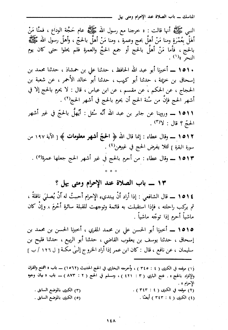 1515 - أَخْبَرَنَا أَبُو الْحَسَنِ عَلِيُّ بْنُ مُحَمَّدٍ الْمُقْرِي، أَنَا الْحَسَنُ بْنُ مُحَمَّدِ بْنِ إِسْحَاقَ، نَا يُوسُفُ بْنُ يَعْقُوبَ الْقَاضِي، نَا أَبُو الرَّبِيعِ، نَا فُلَيْحُ بْنُ سُلَيْمَانَ، عَنْ نَافِعٍ، قَالَ: كَانَ ابْنُ عُمَرَ إِذَا أَرَادَ الْخُرُوجَ إِلَى مَكَّةَ " §-[149]- ادَّهَنَ بِدُهْنٍ لَيْسَ لَهُ رَائِحَةٌ طَيِّبَةٌ، ثُمَّ يَأْتِي مَسْجِدَ ذِي الْحُلَيْفَةِ، فَيُصَلِّي رَكْعَتَيْنِ، ثُمَّ يَرْكَبُ، فَإِذَا اسْتَوَتْ بِهِ رَاحِلَتُهُ قَائِمَةً أَحْرَمَ، ثُمَّ قَالَ: هَكَذَا رَأَيْتُ رَسُولَ اللَّهِ صَلَّى اللهُ عَلَيْهِ وَسَلَّمَ فَعَلَ " وَكَذَلِكَ رَوَاهُ سَالِمُ بْنُ عَبْدِ اللَّهِ، عَنْ أَبِيهِ، فِي وَقْتِ إِهْلَالِ رَسُولِ اللَّهِ صَلَّى اللهُ عَلَيْهِ وَسَلَّمَ حِينَ تَسْتَوِي بِهِ قَائِمَةً وَبِمَعْنَاهُ رَوَاهُ جَابِرُ بْنُ عَبْدِ اللَّهِ، وَأَنَسُ بْنُ مَالِكٍ وَبِمَعْنَاهُ رَوَاهُ أَبُو حَسَّانَ الْأَعْرَجُ، عَنِ ابْنِ عَبَّاسٍ