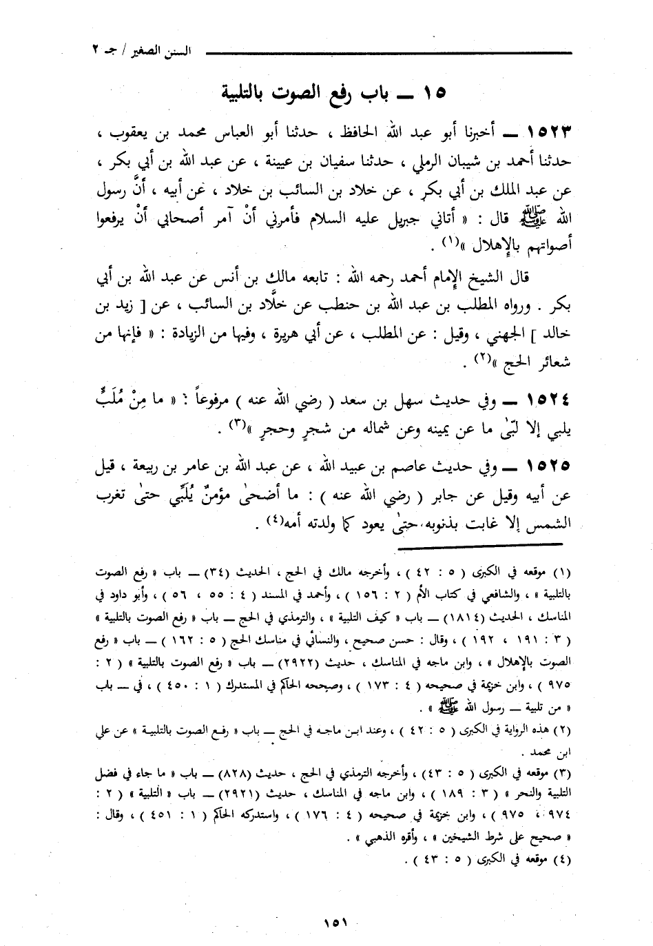 1523 - أَخْبَرَنَا أَبُو عَبْدِ اللَّهِ الْحَافِظُ، نَا أَبُو الْعَبَّاسِ مُحَمَّدُ بْنُ يَعْقُوبَ، نَا أَحْمَدُ بْنُ شَيْبَانَ الرَّمْلِيُّ، نَا سُفْيَانُ بْنُ عُيَيْنَةَ، عَنْ عَبْدِ اللَّهِ بْنِ أَبِي بَكْرٍ، عَنْ عَبْدِ الْمَلِكِ بْنِ أَبِي بَكْرٍ، عَنْ خَلَّادِ بْنِ السَّائِبِ بْنِ خَلَّادٍ، عَنْ أَبِيهِ، أَنَّ رَسُولَ اللَّهِ صَلَّى اللهُ عَلَيْهِ وَسَلَّمَ قَالَ: «§أَتَانِي جِبْرِيلُ، فَأَمَرَنِي أَنْ آمُرَ أَصْحَابِي أَنْ يَرْفَعُوا أَصْوَاتَهُمْ بِالْإِهْلَالِ» قَالَ الشَّيْخُ الْإِمَامُ أَحْمَدُ رَحِمَهُ اللَّهُ: تَابَعَهُ مَالِكُ بْنُ أَنَسٍ، عَنْ عَبْدِ اللَّهِ بْنِ أَبِي بَكْرٍ وَرَوَاهُ الْمُطَّلِبُ بْنُ عَبْدِ اللَّهِ بْنِ حَنْطَبٍ، عَنْ خَلَّادِ بْنِ السَّائِبِ، عَنْ زَيْدِ بْنِ خَالِدٍ الْجُهَنِيِّ