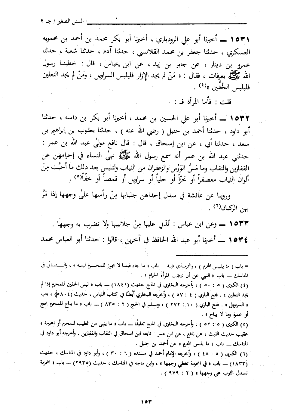 1532 - فَأَخْبَرَنَا أَبُو عَلِيٍّ الْحُسَيْنُ بْنُ مُحَمَّدٍ، أَنَا أَبُو بَكْرِ بْنُ دَاسَةَ، نَا أَبُو دَاوُدَ، نَا أَحْمَدُ بْنُ حَنْبَلٍ رَضِيَ اللَّهُ عَنْهُ، نَا يَعْقُوبُ بْنُ إِبْرَاهِيمَ بْنِ سَعْدٍ، ثنا أَبِي، عَنِ ابْنِ إِسْحَاقَ قَالَ: قَالَ نَافِعٌ مَوْلَى عَبْدِ اللَّهِ بْنِ عُمَرَ: حَدَّثَنِي عَبْدُ اللَّهِ بْنُ عُمَرَ أَنَّهُ سَمِعَ رَسُولَ اللَّهِ صَلَّى اللهُ عَلَيْهِ وَسَلَّمَ «نَهَى النِّسَاءَ فِي إِحْرَامِهِنَّ عَنِ الْقُفَّازَيْنِ، وَالنِّقَابِ، وَمَا مَسَّ الْوَرْسَ وَالزَّعْفَرَانَ مِنَ الثِّيَابِ، وَلْتَلْبَسْ بَعْدَ ذَلِكَ مَا أَحَبَّتْ مِنْ أَلْوَانِ الثِّيَابِ مُعَصْفَرًا أَوْ خَزًّا أَوْ حُلِيًّا أَوْ سَرَاوِيلَ أَوْ قَمِيصًا أَوْ خُفًّا»