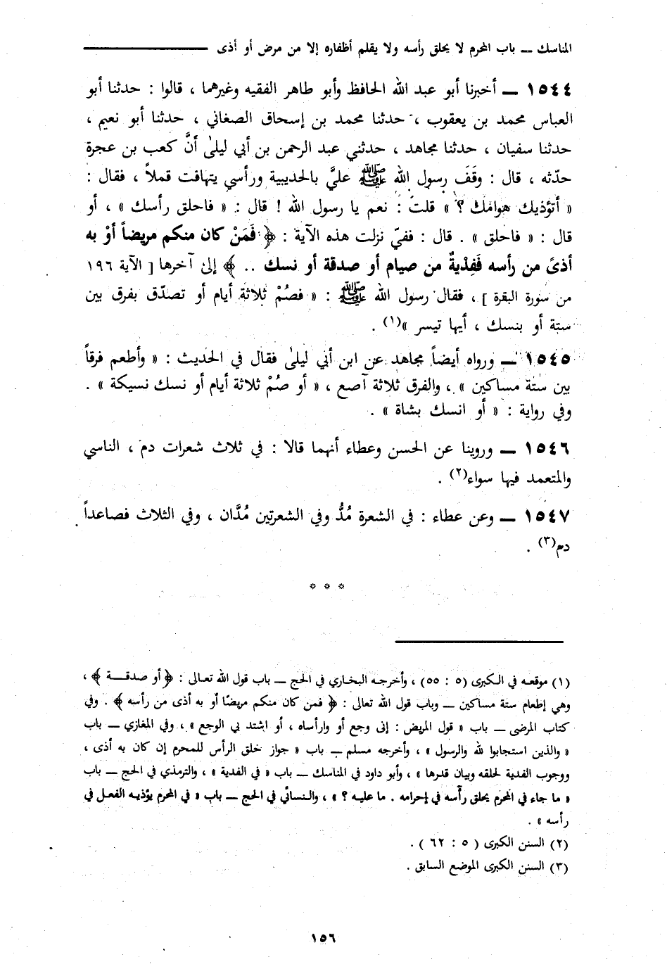 1544 - أَخْبَرَنَا أَبُو عَبْدِ اللَّهِ الْحَافِظُ، وَأَبُو طَاهِرٍ الْفَقِيهُ وَغَيْرُهُمَا، قَالُوا: نَا أَبُو الْعَبَّاسِ مُحَمَّدُ بْنُ يَعْقُوبَ، نَا مُحَمَّدُ بْنُ إِسْحَاقَ الصَّغَانِيُّ، نَا أَبُو نُعَيْمٍ، نَا سَيْفٌ، نَا مُجَاهِدٌ، حَدَّثَنِي عَبْدُ الرَّحْمَنِ بْنُ أَبِي لَيْلَى، أَنَّ كَعْبَ بْنَ عُجْرَةَ، حَدَّثَهُ قَالَ: وَقَفَ رَسُولُ اللَّهِ صَلَّى اللهُ عَلَيْهِ وَسَلَّمَ عَلَيَّ بِالْحُدَيْبِيَةِ وَرَأْسِي يَتَهَافَتُ قَمْلًا فَقَالَ: «§أَتُؤْذِيكَ هَوَامُّكَ؟» قُلْتُ: نَعَمْ يَا رَسُولَ اللَّهِ، قَالَ: «فَاحْلِقْ رَأْسَكَ» أَوْ قَالَ: «فَاحْلِقْ» قَالَ: فَفِيَّ نَزَلَتْ هَذِهِ الْآيَةُ: {فَمَنْ كَانَ مِنْكُمْ مَرِيضًا أَوْ بِهِ أَذًى مِنْ رَأْسِهِ فَفِدْيَةٌ مِنْ صِيَامٍ أَوْ صَدَقَةٍ أَوْ نُسُكٍ} [البقرة: 196] إِلَى آخِرِهَا فَقَالَ رَسُولُ اللَّهِ صَلَّى اللهُ عَلَيْهِ وَسَلَّمَ: «فَصُمْ ثَلَاثَةَ أَيَّامٍ أَوْ تَصَدَّقْ بِفَرَقٍ بَيْنَ سِتَّةٍ أَوِ انْسُكْ بِمَا تَيَسَّرَ»