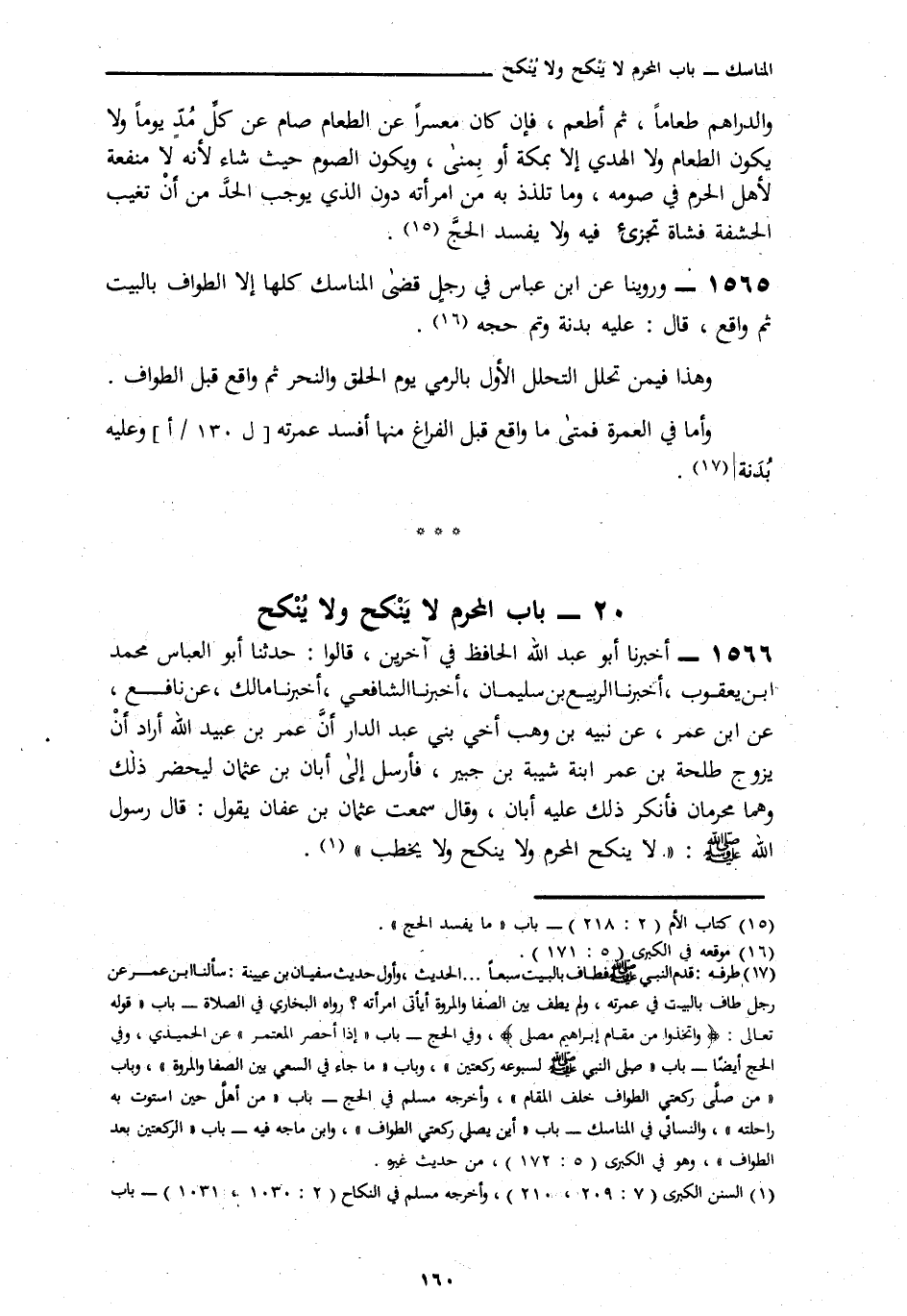1566 - أَخْبَرَنَا أَبُو عَبْدِ اللَّهِ الْحَافِظُ، فِي آخَرِينَ، قَالُوا: نَا أَبُو الْعَبَّاسِ مُحَمَّدُ بْنُ يَعْقُوبَ، أَنَا الرَّبِيعُ بْنُ سُلَيْمَانَ، أَنَا الشَّافِعِيُّ، أَنَا مَالِكٌ، عَنْ نَافِعٍ، عَنِ نُبَيْهِ بْنِ وَهْبٍ، أَخِي بَنِي عَبْدِ الدَّارِ، أَنَّ عُمَرَ بْنَ عُبَيْدِ اللَّهِ، أَرَادَ أَنْ يُزَوِّجَ طَلْحَةَ بْنَ عُمَرَ ابْنَةَ شَيْبَةَ بْنِ جُبَيْرٍ، فَأَرْسَلَ إِلَى أَبَانَ بْنِ عُثْمَانَ، لِيَحْضُرَ ذَلِكَ وَهُمَا مُحْرِمَانِ فَأَنْكَرَ ذَلِكَ عَلَيْهِ أَبَانُ، وَقَالَ: سَمِعْتُ عُثْمَانَ بْنَ عَفَّانَ يَقُولُ: قَالَ رَسُولُ اللَّهِ صَلَّى اللهُ عَلَيْهِ وَسَلَّمَ: § «لَا يَنْكِحُ الْمُحْرِمُ وَلَا يُنْكَحُ ولَا يَخْطُبُ» -[161]- وَرُوِّينَا عَنْ عُمَرَ، وَعَلِيٍّ، وَزَيْدِ بْنِ ثَابِتٍ، وَابْنِ عُمَرَ فِي رَدِّ نِكَاحِ الْمُحْرِمِ