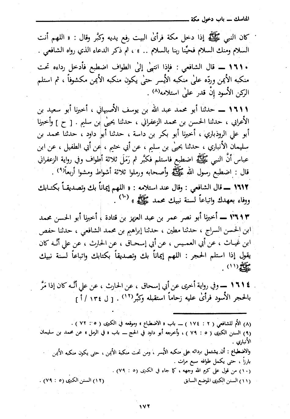 1612 - قَالَ الشَّافِعِيُّ: وَقَالَ عِنْدَ اسْتِلَامِهِ: اللَّهُمَّ إِيمَانًا بِكَ وَتَصْدِيقًا بِكِتَابِكَ وَوَفَاءً بِعَهْدِكَ وَاتِّبَاعًا لِسُنَّةِ نَبِيِّكَ مُحَمَّدٍ صَلَّى اللهُ عَلَيْهِ وَسَلَّمَ