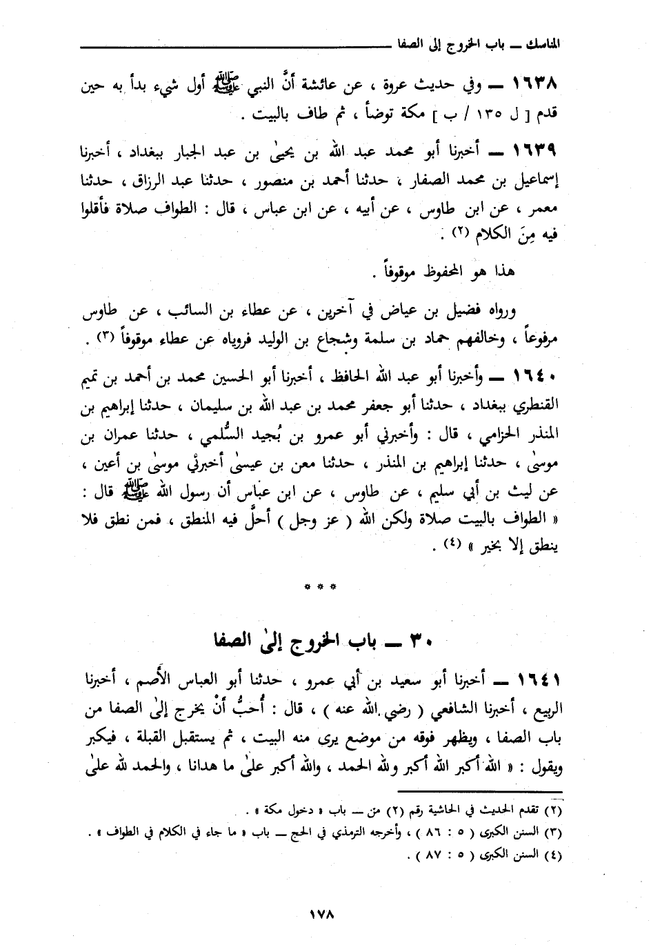 1639 - أَخْبَرَنَا أَبُو مُحَمَّدٍ عَبْدُ اللَّهِ بْنُ يَحْيَى بْنِ عَبْدِ الْجَبَّارِ، بِبَغْدَادَ، نَا إِسْمَاعِيلُ بْنُ مُحَمَّدٍ الصَّفَّارُ، نَا أَحْمَدُ بْنُ مَنْصُورٍ، نَا عَبْدُ الرَّزَّاقِ، أَنَا مَعْمَرٌ، عَنِ ابْنِ طَاوُسٍ، عَنْ أَبِيهِ، عَنِ ابْنِ عَبَّاسٍ، قَالَ: § «الطَّوَافُ صَلَاةٌ فَأَقِلُّوا فِيهِ مِنَ الْكَلَامِ» هَذَا هُوَ الْمَحْفُوظُ مَوْقُوفًا. وَرَوَاهُ فُضَيْلُ بْنُ عِيَاضٍ فِي آخَرِينَ، عَنْ عَطَاءِ بْنِ السَّائِبِ، عَنْ طَاوُسٍ مَرْفُوعًا، وَخَالَفَهُمْ حَمَّادُ بْنُ سَلَمَةَ وَشُجَاعُ بْنُ الْوَلِيدِ فَرَوَيَاهُ عَنْ عَطَاءٍ مَوْقُوفًا