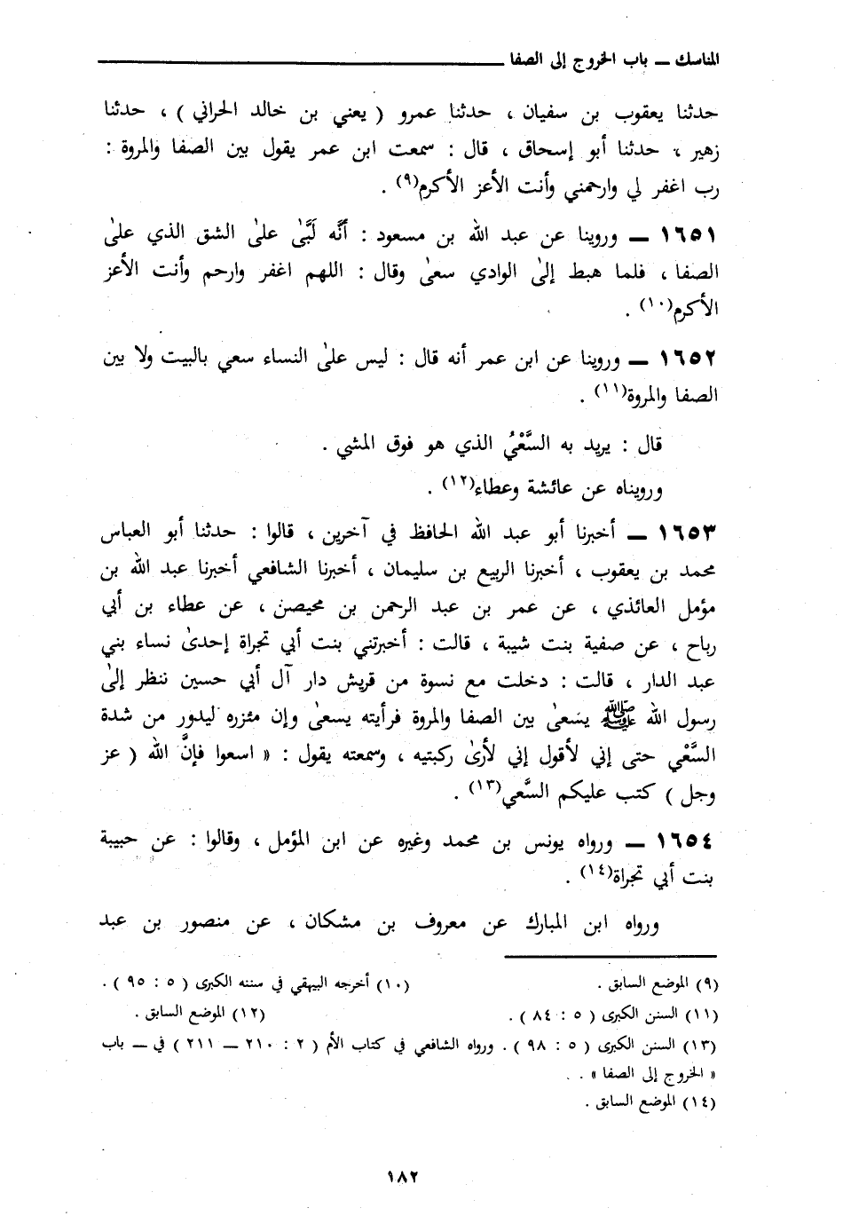 1653 - أَخْبَرَنَا أَبُو عَبْدِ اللَّهِ الْحَافِظُ، فِي آخَرِينَ قَالُوا: نَا أَبُو الْعَبَّاسِ مُحَمَّدُ بْنُ يَعْقُوبَ، أَنَا الرَّبِيعُ بْنُ سُلَيْمَانَ، أَنَا الشَّافِعِيُّ، أَنَا عَبْدُ اللَّهِ بْنُ مُؤَمَّلٍ الْعَائِذِيُّ، عَنْ عُمَرَ بْنِ عَبْدِ الرَّحْمَنِ بْنِ مُحَيْصِنٍ، عَنْ عَطَاءِ بْنِ أَبِي رَبَاحٍ، عَنْ صَفِيَّةَ بِنْتِ شَيْبَةَ، قَالَتْ: أَخْبَرَتْنِي بِنْتُ أَبِي تَجْرأَةَ، إِحْدَى نِسَاءِ بَنِي عَبْدِ الدَّارِ، قَالَتْ: دَخَلْتُ مَعَ نِسْوَةٍ مِنْ قُرَيْشٍ دَارٍ لِأَبِي حُسَيْنٍ نَنْظُرُ إِلَى رَسُولِ اللَّهِ صَلَّى اللهُ عَلَيْهِ وَسَلَّمَ يَسْعَى بَيْنَ الصَّفَا وَالْمَرْوَةِ فَرَأَيْتُهُ يَسْعَى وَإِنَّ مِئْزَرَهُ لَيَدُورُ مِنْ شِدَّةِ السَّعْي، حَتَّى إِنِّي لَأَرَى رُكْبَتَيْهِ، وَسَمِعْتُهُ يَقُولُ: § «اسْعَوْا فَإِنَّ اللَّهَ كَتَبَ عَلَيْكُمُ السَّعْيَ»