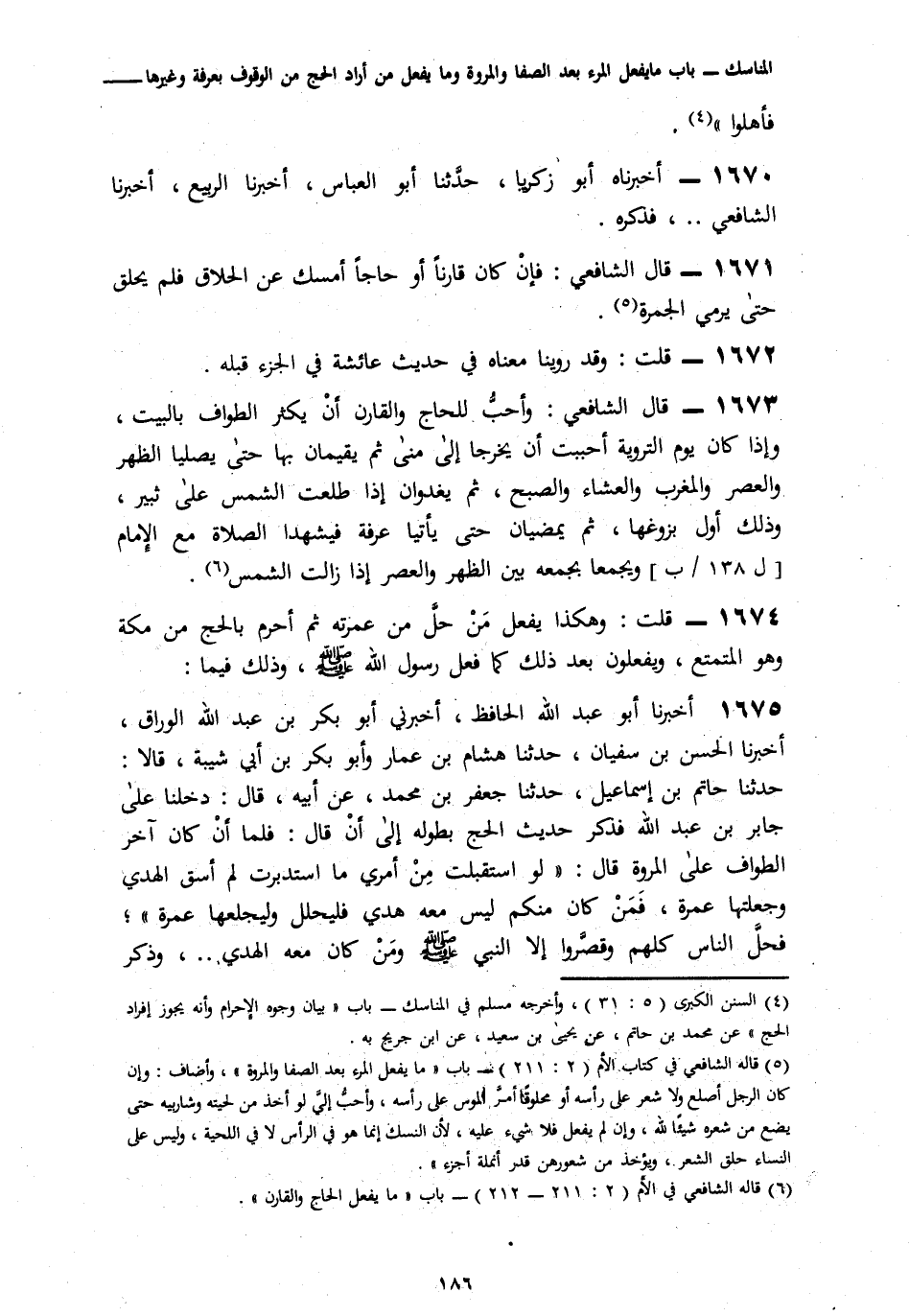 1675 - أَخْبَرَنَا أَبُو عَبْدِ اللَّهِ الْحَافِظُ، أَخْبَرَنِي أَبُو بَكْرِ بْنُ عَبْدِ اللَّهِ الْوَرَّاقُ، أَنَا الْحَسَنُ بْنُ سُفْيَانَ، نَا هِشَامُ بْنُ عَمَّارٍ، وَأَبُو بَكْرِ بْنُ أَبِي شَيْبَةَ قَالَا: نَا حَاتِمُ بْنُ إِسْمَاعِيلَ، نَا جَعْفَرُ بْنُ مُحَمَّدٍ، عَنْ أَبِيهِ، قَالَ: دَخَلْنَا عَلَى جَابِرِ بْنِ عَبْدِ اللَّهِ، فَذَكَرَ حَدِيثَ الْحَجِّ بِطُولِهِ إِلَى أَنْ قَالَ: فَلَمَّا أَنْ كَانَ آخِرُ الطَّوَافِ عَلَى الْمَرْوَةِ قَالَ: «لَوِ اسْتَقْبَلْتُ مِنْ أَمْرِي مَا اسْتَدْبَرْتُ لَمْ أَسُقِ الْهَدْيَ وَجَعَلْتُهَا عُمْرَةً، فَمَنْ كَانَ مِنْكُمْ لَيْسَ مَعَهُ هَدْي فَلْيَحْلِلْ وَلْيَجْعَلْهَا عُمْرَةً» فَحَلَّ النَّاسُ كُلُّهُمْ وَقَصَّرُوا إِلَّا النَّبِيَّ صَلَّى اللهُ عَلَيْهِ وَسَلَّمَ وَمَنْ كَانَ مَعَهُ الْهَدْي، وَذَكَرَ -[187]- الْحَدِيثَ. قَالَ: فَلَمَّا كَانَ يَوْمُ التَّرْوِيَةِ وَوَجَّهُوا إِلَى مِنًى أَهَلُّوا بِالْحَجِّ وَرَكِبَ رَسُولُ اللَّهِ صَلَّى اللهُ عَلَيْهِ وَسَلَّمَ" §فَصَلَّى بِنَا بِمِنًى الظُّهْرَ وَالْعَصْرَ وَالْمَغْرِبَ وَالْعِشَاءَ وَالصُّبْحَ، ثُمَّ مَكَثَ قَلِيلًا حَتَّى طَلَعَتِ الشَّمْسُ وَأَمَرَ بِقُبَّةٍ مِنْ شَعْرٍ فَضُرِبَتْ لَهُ بِنَمِرَةَ، فَسَارَ رَسُولُ اللَّهِ صَلَّى اللهُ عَلَيْهِ وَسَلَّمَ، وَلَا تَشُكُّ قُرَيْشٌ إِلَّا أَنَّهُ وَاقِفٌ عِنْدَ الْمَشْعَرِ الْحَرَامِ كَمَا كَانَتْ قُرَيْشٌ تَصْنَعُ فِي الْجَاهِلِيَّةِ، فَأَجَازَهُ رَسُولُ اللَّهِ صَلَّى اللهُ عَلَيْهِ وَسَلَّمَ حَتَّى أَتَى عَرَفَةَ فَوَجَدَ الْقُبَّةَ قَدْ ضُرِبَتْ لَهُ بِنَمِرَةَ، فَنَزَلَ بِهَا حَتَّى إِذَا زَاغَتِ الشَّمْسُ أَمَرَ بِالْقَصْوَاءِ فَرُحِّلَتْ لَهُ، فَرَكِبَ حَتَّى أَتَى بَطْنَ الْوَادِي، فَخَطَبَ النَّاسَ فَقَالَ: «إِنَّ دِمَاءَكُمْ وَأَمْوَالَكُمْ حَرَامٌ عَلَيْكُمْ كَحُرْمَةِ يَوْمِكُمْ هَذَا فِي شَهْرِكُمْ هَذَا فِي بَلَدِكُمْ هَذَا» فَذَكَرَ الْحَدِيثَ فِي خُطْبَتِهِ. قَالَ: ثُمَّ أَذَّنَ بِلَالٌ، ثُمَّ أَقَامَ فَصَلَّى الظُّهْرَ، ثُمَّ أَقَامَ فَصَلَّى الْعَصْرَ وَلَمْ يُصَلِّ بَيْنَهُمَا شَيْئًا، ثُمَّ رَكِبَ رَسُولُ اللَّهِ صَلَّى اللهُ عَلَيْهِ وَسَلَّمَ حَتَّى أَتَى الْمَوْقِفَ فَجَعَلَ بَطْنَ نَاقَتِهِ إِلَى الصَّخْرَاتِ وَجَعَلَ حَبَلَ الشَّاةِ بَيْنَ يَدَيْهِ وَاسْتَقْبَلَ الْقِبْلَةَ فَلَمْ يَزَلْ وَاقِفًا حَتَّى غَرَبَتِ الشَّمْسُ وَذَهَبَتِ الصُّفْرَةُ قَلِيلًا حَتَّى غَابَ الْقُرْصُ وأَرْدَفَ أُسَامَةَ بْنَ زَيْدٍ خَلْفَهُ فَدَفَعَ رَسُولُ اللَّهِ صَلَّى اللهُ عَلَيْهِ وَسَلَّمَ وَقَدْ شنَقَ لِلْقَصْوَاءِ الزِّمَامَ حَتَّى إِنَّ رَأْسَهَا لَيُصِيبُ مَوْرِكَ رَحْلِهِ، وَيَقُولُ بِيَدِهِ الْيُمْنَى: «أَيُّهَا النَّاسُ، السَّكِينَةَ السَّكِينَةَ» كُلَّمَا أَتَى حَبْلًا مِنَ الْحِبَالِ أَرْخَى لَهَا قَلِيلًا حَتَّى تَصْعَدُ، ثُمَّ أَتَى الْمُزْدَلِفَةَ، فَصَلَّى بِهَا الْمَغْرِبَ وَالْعِشَاءَ بِأَذَانٍ وَإِقَامَتَيْنِ، وَلَمْ يُصَلِّ بَيْنَهُمَا شَيْئًا، ثُمَّ اضْطَجَعَ رَسُولُ اللَّهِ صَلَّى اللهُ عَلَيْهِ وَسَلَّمَ حَتَّى طَلَعَ الْفَجْرُ، فَصَلَّى الْفَجْرَ حَتَّى تَبَيَّنَ لَهُ الصُّبْحُ بِأَذَانٍ وَإِقَامَةٍ، ثُمَّ رَكِبَ الْقَصْوَاءَ حَتَّى أَتَى الْمَشْعَرَ الْحَرَامَ فَرَقِيَ عَلَيْهِ فَحَمِدَ اللَّهَ وَكَبَّرَهُ وَهَلَّلَهُ، فَلَمْ يَزَلْ وَاقِفًا حَتَّى أَسْفَرَ جِدًّا ثُمَّ دَفَعَ قَبْلَ أَنْ تَطْلُعَ الشَّمْسُ وَأَرْدَفَ الْفَضْلَ بْنَ عَبَّاسٍ وَكَانَ رَجُلًا أَبْيَضَ حَسَنَ الشَّعْرِ وَسِيمًا، فَلَمَّا دَفَعَ رَسُولُ اللَّهِ صَلَّى اللهُ عَلَيْهِ وَسَلَّمَ مَرَّ ظَع
