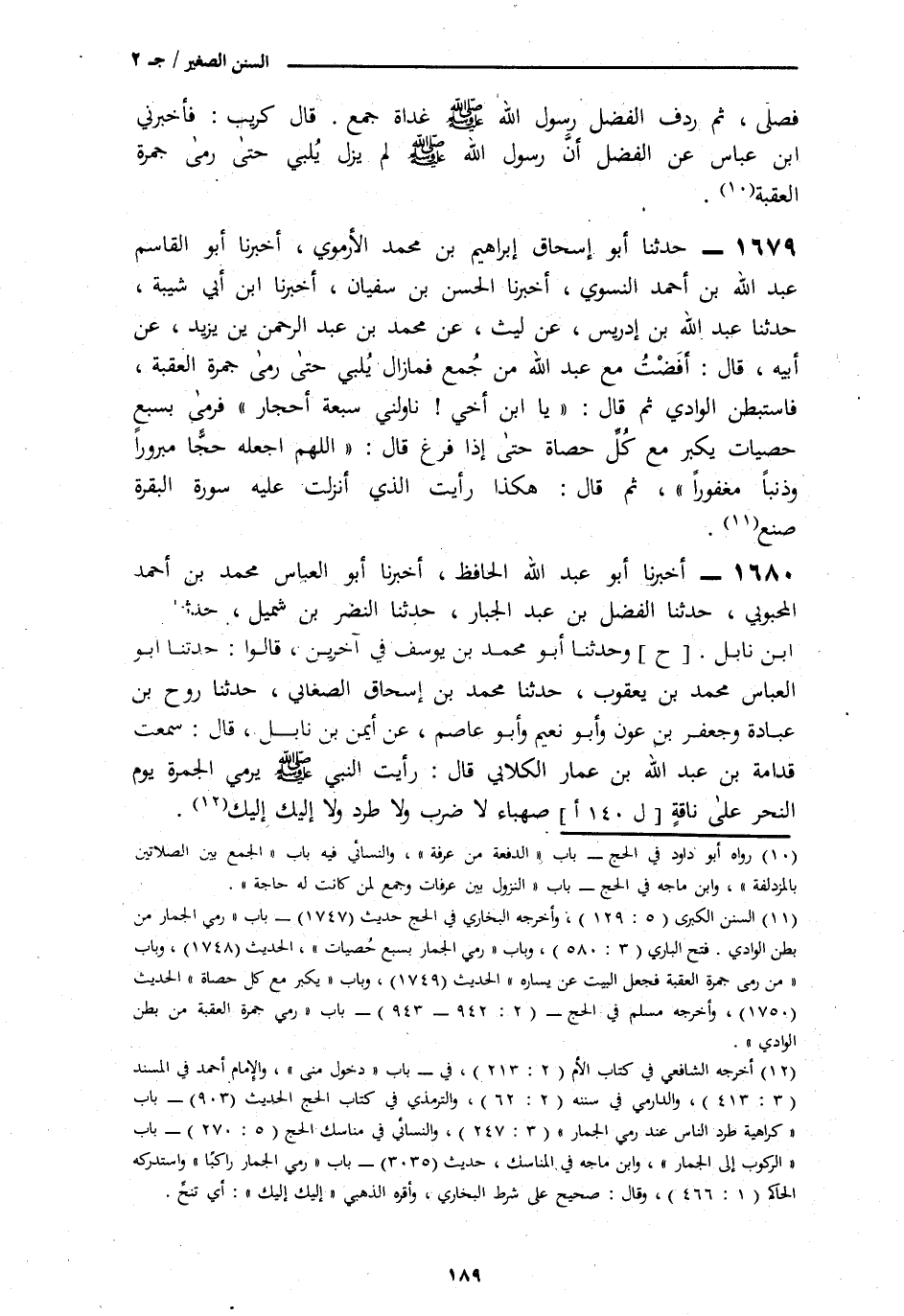 1679 - حَدَّثَنَا أَبُو إِسْحَاقَ إِبْرَاهِيمُ بْنُ مُحَمَّدٍ الْأَرْمَوِيُّ، أَنَا أَبُو الْقَاسِمِ عَبْدُ اللَّهِ بْنُ مُحَمَّدٍ النَّسَوِيُّ، أَنَا الْحَسَنُ بْنُ سُفْيَانَ، أَنَا ابْنُ أَبِي شَيْبَةَ، نَا عَبْدُ اللَّهِ بْنُ إِدْرِيسَ، عَنْ لَيْثٍ، عَنْ مُحَمَّدِ بْنِ عَبْدِ الرَّحْمَنِ بْنِ يَزِيدَ، عَنْ أَبِيهِ، قَالَ: أَفَضْتُ مَعَ عَبْدِ اللَّهِ مِنْ جَمْعٍ، فَمَا زَالَ يُلَبِّي حَتَّى رَمَى جَمْرَةَ الْعَقَبَةَ، فَاسْتَبْطَنَ الْوَادِي، ثُمَّ قَالَ: «يَا ابْنَ أَخِي نَاوِلْنِي سَبْعَةَ أَحْجَارٍ» §" فَرَمَاهَا بِسَبْعِ حَصَيَاتٍ يُكَبِّرُ مَعَ كُلِّ حَصَاةٍ حَتَّى إِذَا فَرَغَ قَالَ: «اللَّهُمَّ اجْعَلْهُ حَجًّا مَبْرُورًا وَذَنْبًا مَغْفُورًا» ثُمَّ قَالَ: هَكَذَا رَأَيْتُ الَّذِيَ أُنْزِلَتْ عَلَيْهِ سُورَةُ الْبَقَرَةِ صَنَعَ