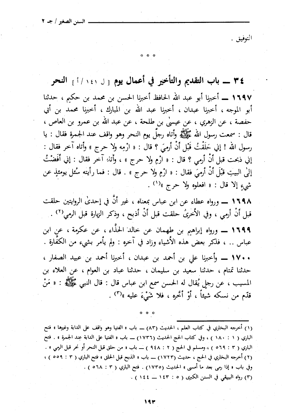 1697 - أَخْبَرَنَا أَبُو عَبْدِ اللَّهِ الْحَافِظُ، أَنَا الْحَسَنُ بْنُ مُحَمَّدِ بْنِ حَلِيمٍ، كَذَا فِي الْكُبْرَى وَفِي الْمُجَلَّدِ وَالْقَلْعَجِيِّ حَكِيمٌ، نَا أَبُو الْمُوَجِّهِ، أَنَا عَبْدَانُ، أَنَا عَبْدُ اللَّهِ بْنُ الْمُبَارَكِ، أَنَا مُحَمَّدُ بْنُ أَبِي حَفْصَةَ، عَنِ الزُّهْرِيِّ، عَنْ عِيسَى بْنِ طَلْحَةَ، عَنْ عَبْدِ اللَّهِ بْنِ عَمْرِو بْنِ الْعَاصِ قَالَ: سَمِعْتُ رَسُولَ اللَّهِ صَلَّى اللهُ عَلَيْهِ وَسَلَّمَ وَأَتَاهُ رَجُلٌ يَوْمَ النَّحْرِ وَهُوَ وَاقِفٌ عِنْدَ الْجَمْرَةِ فَقَالَ: يَا رَسُولَ اللَّهِ، إِنِّي حَلَقْتُ قَبْلَ أَنْ أَرْمِيَ؟ قَالَ: «ارْمِهْ وَلَا حَرَجَ» وَأَتَاهُ آخَرُ فَقَالَ: إِنِّي ذَبَحْتُ قَبْلَ أَنْ أَرْمِيَ؟ قَالَ: «ارْمِ وَلَا حَرَجَ» وَأَتَاهُ آخَرُ فَقَالَ: إِنِّي أَفَضْتُ إِلَى الْبَيْتِ قَبْلَ أَنْ أَرْمِيَ. فَقَالَ: «ارْمِ وَلَا حَرَجَ» قَالَ: فَمَا رَأَيْتُهُ سُئِلَ يَوْمَئِذٍ عَنْ شَيْءٍ إِلَّا قَالَ: § «افْعَلُوه وَلَا حَرَجَ»