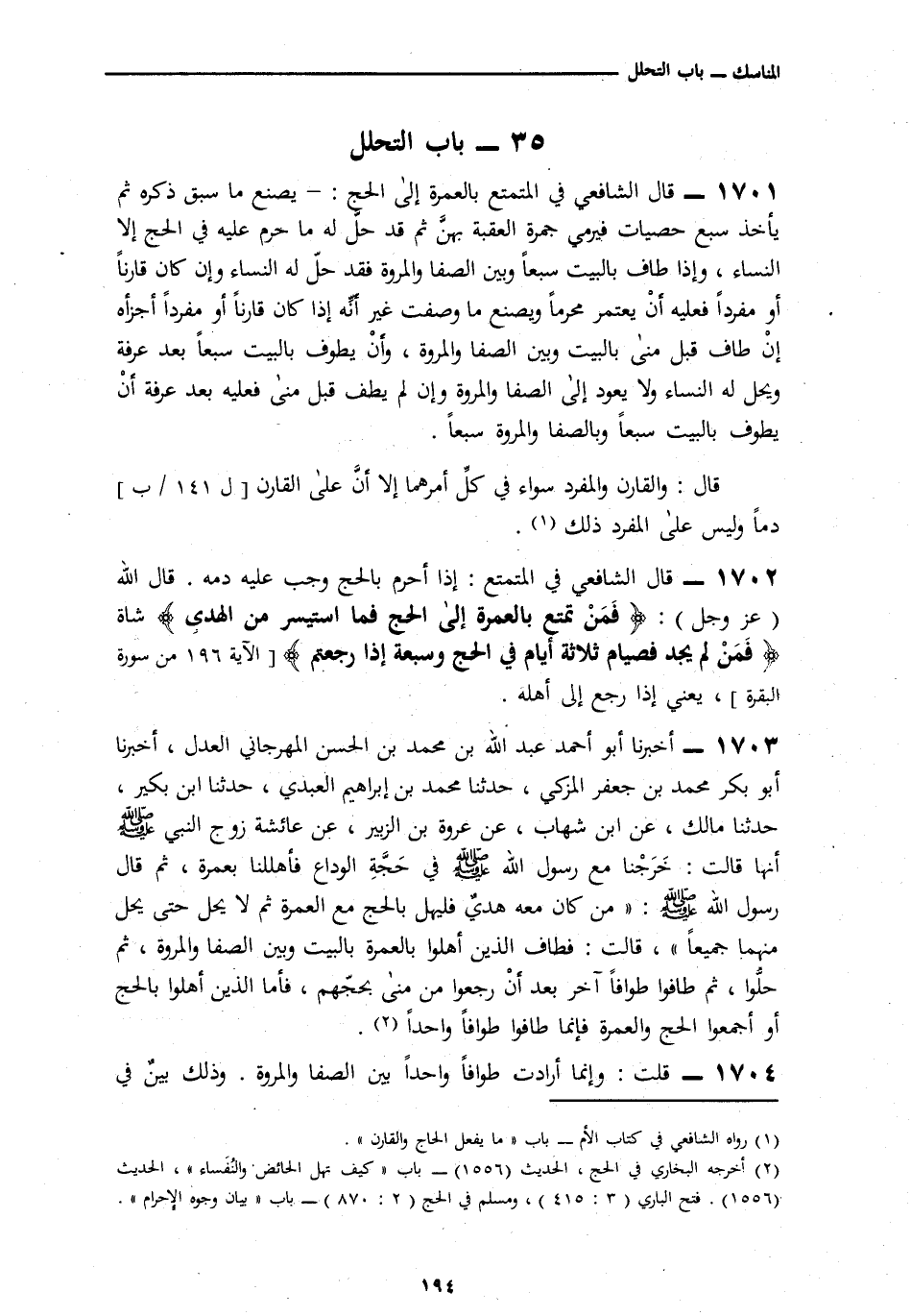 1701 - قَالَ الشَّافِعِيُّ فِي الْمُتَمَتِّعِ بِالْعُمْرَةِ إِلَى الْحَجِّ: يَصْنَعُ مَا سَبَقَ ذِكْرُهُ، ثُمَّ يَأْخُذُ سَبْعَ حَصَيَاتٍ فَيَرْمِي جَمْرَةَ الْعَقَبَةِ بِهِنَّ، ثُمَّ قَدْ حَلَّ لَهُ مَا حَرُمَ عَلَيْهِ فِي الْحَجِّ إِلَّا النِّسَاءُ، وَإِذَا طَافَ بِالْبَيْتِ سَبْعًا وَبَيْنَ الصَّفَا وَالْمَرْوَةِ فَقَدْ حَلَّ لَهُ النِّسَاءُ، وَإِنْ كَانَ قَارِنًا أَوْ مُفْرِدًا فَعَلَيْهِ أَنْ يُقِيمَ مُحْرِمًا بِحَالِهِ وَيَصْنَعَ مَا وَصَفْتُ غَيْرَ أَنَّهُ إِذَا كَانَ قَارِنًا أَوْ مُفْرِدًا أَجْزَأَهُ إِنْ طَافَ قَبْلَ مِنًى بِالْبَيْتِ وَبَيْنَ الصَّفَا وَالْمَرْوَةِ، أَنْ يَطُوفَ بِالْبَيْتِ سَبْعًا بَعْدَ عَرَفَةَ وَيَحِلُّ لَهُ النِّسَاءُ وَلَا يَعُودُ إِلَى الصَّفَا وَالْمَرْوَةِ وَإِنْ لَمْ يَطُفْ قَبْلَ مِنًى، فَعَلَيْهِ بَعْدَ عَرَفَةَ أَنْ يَطُوفَ بِالْبَيْتِ سَبْعًا وَبِالصَّفَا وَالْمَرْوَةِ سَبْعًا. قَالَ: وَالْقَارِنُ وَالْمُفْرِدُ سَوَاءٌ فِي كُلِّ أَمْرِهِمَا إِلَّا أَنَّ عَلَىَ الْقَارِنِ دَمًا وَلَيْسَ عَلَى الْمُفْرِدِ ذَلِكَ.
