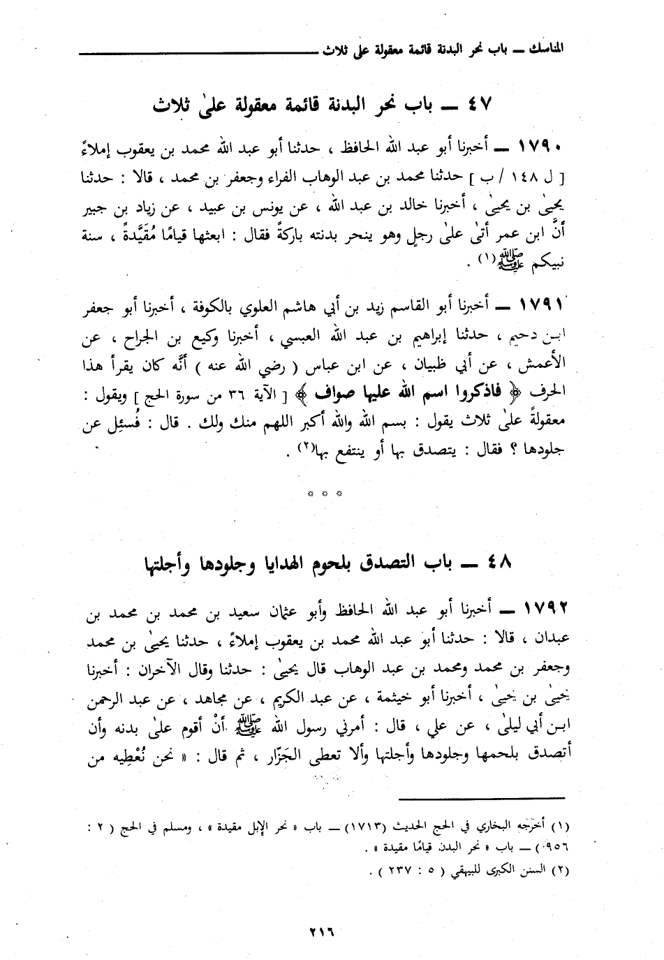 1791 - أَخْبَرَنَا أَبُو الْقَاسِمِ زَيْدُ بْنُ أَبِي هَاشِمٍ الْعَلَوِيُّ بِالْكُوفَةِ، أَنَا أَبُو جَعْفَرِ بْنُ دُحَيْمٌ، نَا إِبْرَاهِيمُ بْنُ عَبْدِ اللَّهِ الْعَبْسِيُّ، أَنَا وَكِيعُ بْنُ الْجَرَّاحِ، عَنِ الْأَعْمَشِ، عَنْ أَبِي ظَبْيَانَ، عَنِ ابْنِ عَبَّاسِ رَضِيَ اللَّهُ عَنْهُ، أَنَّهُ كَانَ يَقْرَأُ هَذَا الْحَرْفَ " (§فَاذْكُرُوا اسْمَ اللَّهِ عَلَيْهَا صَوَافِنَ) وَيَقُولُ: مَعْقُولَةٌ عَلَى ثَلَاثٍ يَقُولُ: بِسْمِ اللَّهِ وَاللَّهُ أَكْبَرُ اللَّهُمَّ مِنْكَ وَلَكَ. قَالَ: فَسُئِلَ عَنْ جُلُودِهَا؟ فَقَالَ: يُتَصَدَّقُ بِهَا أَوْ يُنْتَفَعُ بِهَا "