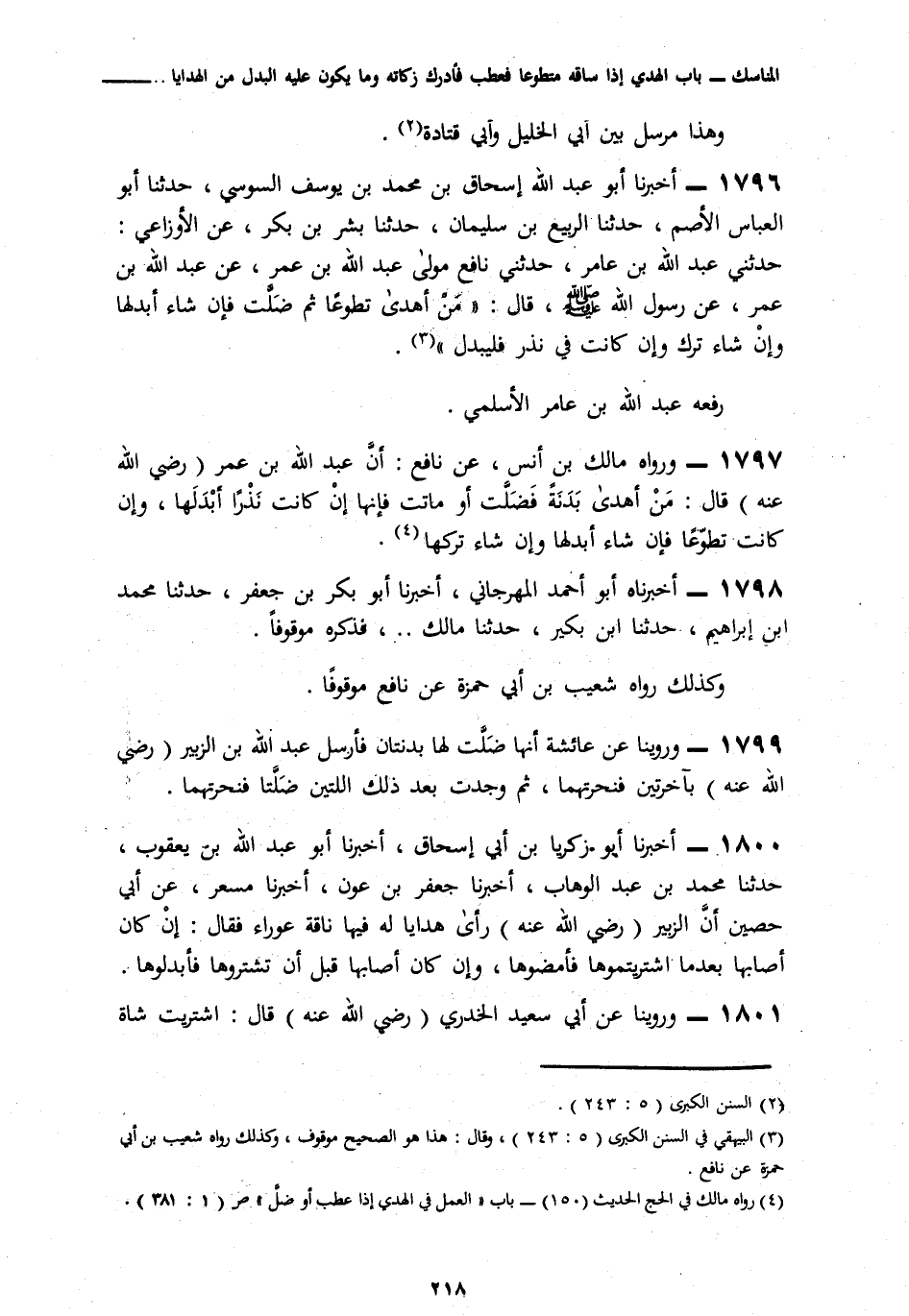 1799 - وَرُوِّينَا عَنْ عَائِشَةَ، § «أَنَّهَا ضَلَّتْ لَهَا بَدَنَتَانِ فَأَرْسَلَ عَبْدُ اللَّهِ بْنُ الزُّبَيْرِ رَضِيَ اللَّهُ عَنْهُ بِآخَرَتَيْنِ فَنَحَرْتُهُمَا، ثُمَّ وَجَدْتُ بَعْدَ ذَلِكَ اللَّتَيْنِ ضَلَّتَا فَنَحَرْتُهُمَا»