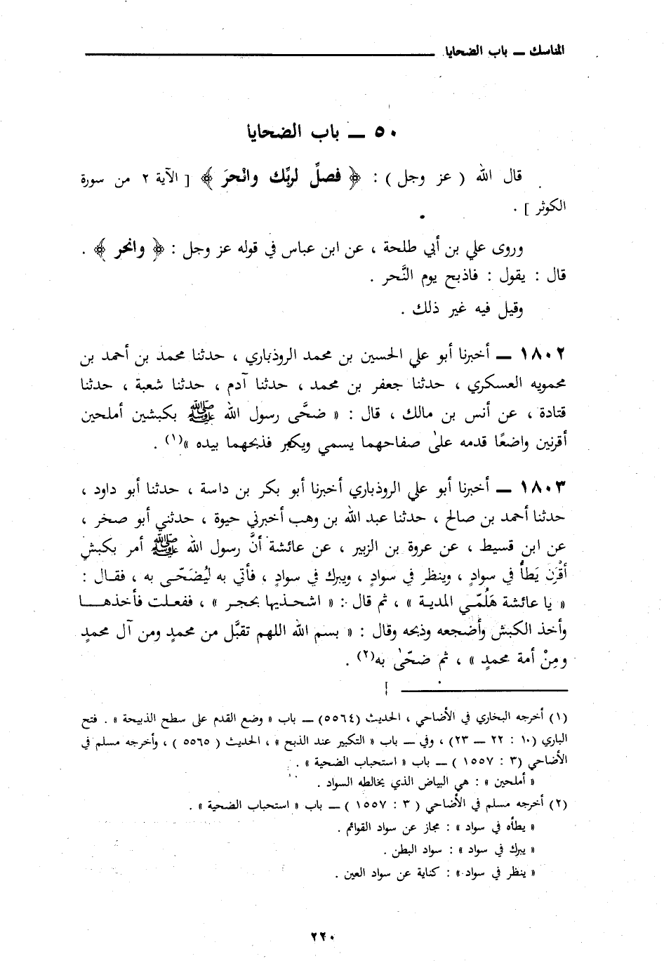 1802 - أَخْبَرَنَا أَبُو عَلِيِّ بْنُ الْحُسَيْنِ بْنِ مُحَمَّدٍ الرُّوذْبَارِيُّ، نَا مُحَمَّدُ بْنُ أَحْمَدَ بْنِ حَمَوَيْهِ الْعَسْكَرِيُّ، نَا جَعْفَرُ بْنُ مُحَمَّدٍ، نَا آدَمٌ، نَا شُعْبَةُ، نَا قَتَادَةُ، عَنْ أَنَسِ بْنِ مَالِكٍ، قَالَ: § «ضَحَّى رَسُولُ اللَّهِ صَلَّى اللهُ عَلَيْهِ وَسَلَّمَ بِكَبْشَيْنِ أَمْلَحَيْنِ أَقْرَنَيْنِ وَاضِعًا قَدَمَهُ عَلَى صِفَاحِهِمَا، يُسَمِّي وَيُكَبِّرُ ويَذبَحُهُمَا بِيَدِهِ»