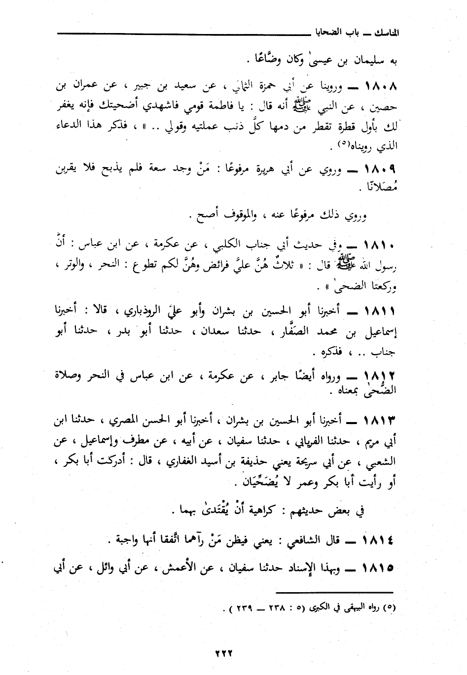 1808 - وَرُوِّينَا عَنْ أَبِي حَمْزَةَ الثُّمَالِي، عَنْ سَعِيدِ بْنِ جُبَيْرٍ، عَنْ عِمْرَانَ بْنِ حُصَيْنٍ، عَنِ النَّبِيِّ صَلَّى اللهُ عَلَيْهِ وَسَلَّمَ أَنَّهُ قَالَ: «يَا فَاطِمَةُ §» قَوْمِي فَاشْهَدِي أُضْحِيَّتَكَ فَإِنَّهُ يُغْفَرُ لَكِ بِأَوَّلِ قَطْرَةٍ تَقْطُرُ مِنْ دَمِهَا كُلُّ ذَنْبٍ عَمَلْتِيهِ وَقُولِي «فَذَكَرَ هَذَا الدُّعَاءَ الَّذِي رُوِّينَاهُ»