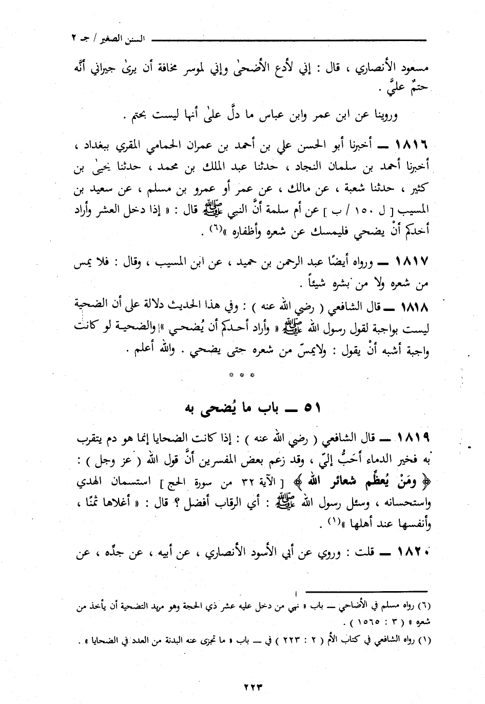 1818 - قَالَ الشَّافِعِيُّ رَضِيَ اللهُ عَنْهُ: وَفِي هَذَا الْحَدِيثِ دَلَالَةٌ عَلَى أَنَّ الضَّحِيَّةَ لَيْسَتْ بِوَاجِبَةٍ لِقَوْلِ رَسُولِ اللَّهِ صَلَّى اللهُ عَلَيْهِ وَسَلَّمَ «وَأَرَادَ أَحَدُكُمْ أَنْ يُضَحِّيَ» وَالضَّحِيَّةُ لَوْ كَانَتْ وَاجِبَةً أَشْبَهُ أَنْ يَقُولَ: وَلَا يَمَسَّ مِنْ شَعْرِهِ حَتَّى يُضَحِّيَ. وَاللهُ أَعْلَمُ