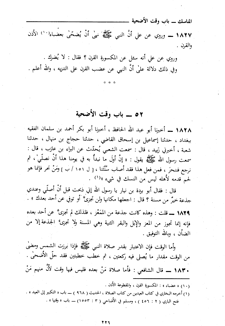 1829 - قُلْتُ: وَهَذِهِ كَانَتْ جَذَعَةً مِنَ الْمَعْزِ، وَلِذَلِكَ لَمْ يُجْزِ عَنْ أَحَدٍ بَعْدَهُ فَإِنَّهُ إِنَّمَا تَجُوزُ مِنَ الْمَعْزِ وَالْإِبِلِ وَالْبَقَرِ الثَّنِيَّةِ وَهِيَ الْمُسِنَّةُ وَلَا تُجْزِئُ الْجَذَعَةُ إِلَّا مِنَ الضَّأْنِ " وَبِاللَّهِ التَّوْفِيقُ. وَأَمَّا الْوَقْتُ فَإِنَّ الِاعِتِبَارَ بِقَدْرِ صَلَاةِ النَّبِيِّ صَلَّى اللهُ عَلَيْهِ وَسَلَّمَ فَإِذَا بَرَزَتِ الشَّمْسُ وَمَضَى مِنَ الْوَقْتِ مِقْدَارُ مَا يُصَلَّى فِيهِ رَكْعَتَيْنِ، ثُمَّ يَخْطُبَ خُطْبَتَيْنِ فَقَدْ حَلَّ الْأَضْحَى