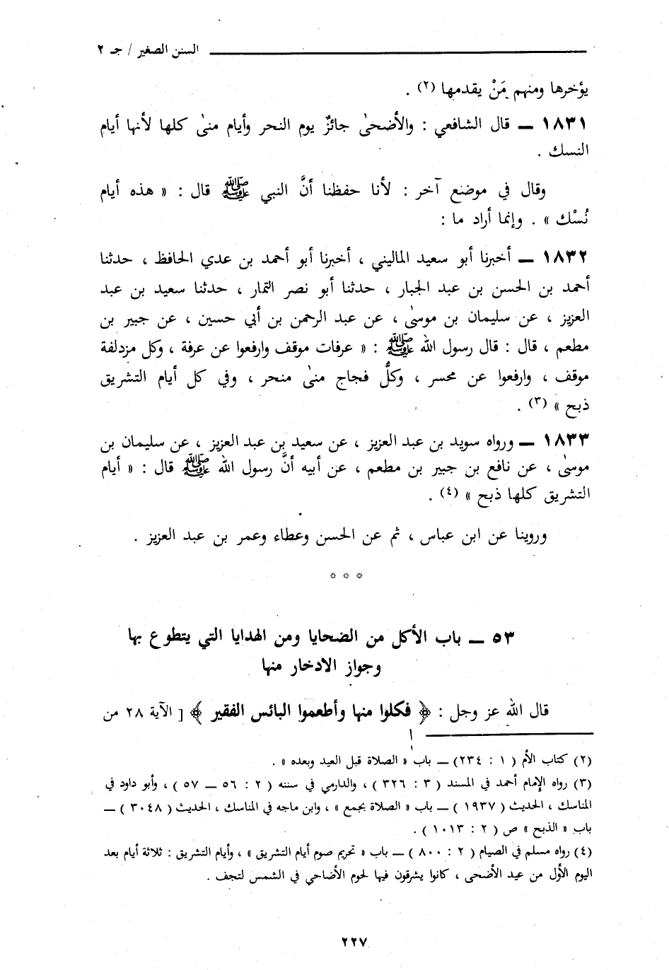 1833 - وَرَوَاهُ سُوَيْدُ بْنُ عَبْدِ الْعَزِيزِ، عَنْ سَعِيدِ بْنِ عَبْدِ الْعَزِيزِ، عَنْ سُلَيْمَانَ بْنِ مُوسَى، عَنْ نَافِعِ بْنِ جُبَيْرِ بْنِ مُطْعِمٍ، عَنْ أَبِيهِ، أَنَّ رَسُولَ اللَّهِ صَلَّى اللهُ عَلَيْهِ وَسَلَّمَ قَالَ: «أَيَّامُ التَّشْرِيقِ كُلُّهَا ذَبْحٌ» وَرُوِّينَا عَنِ ابْنِ عَبَّاسٍ، ثُمَّ عَنِ الْحَسَنِ وَعَطَاءٍ وَعُمَرَ بْنِ عَبْدِ الْعَزِيزِ