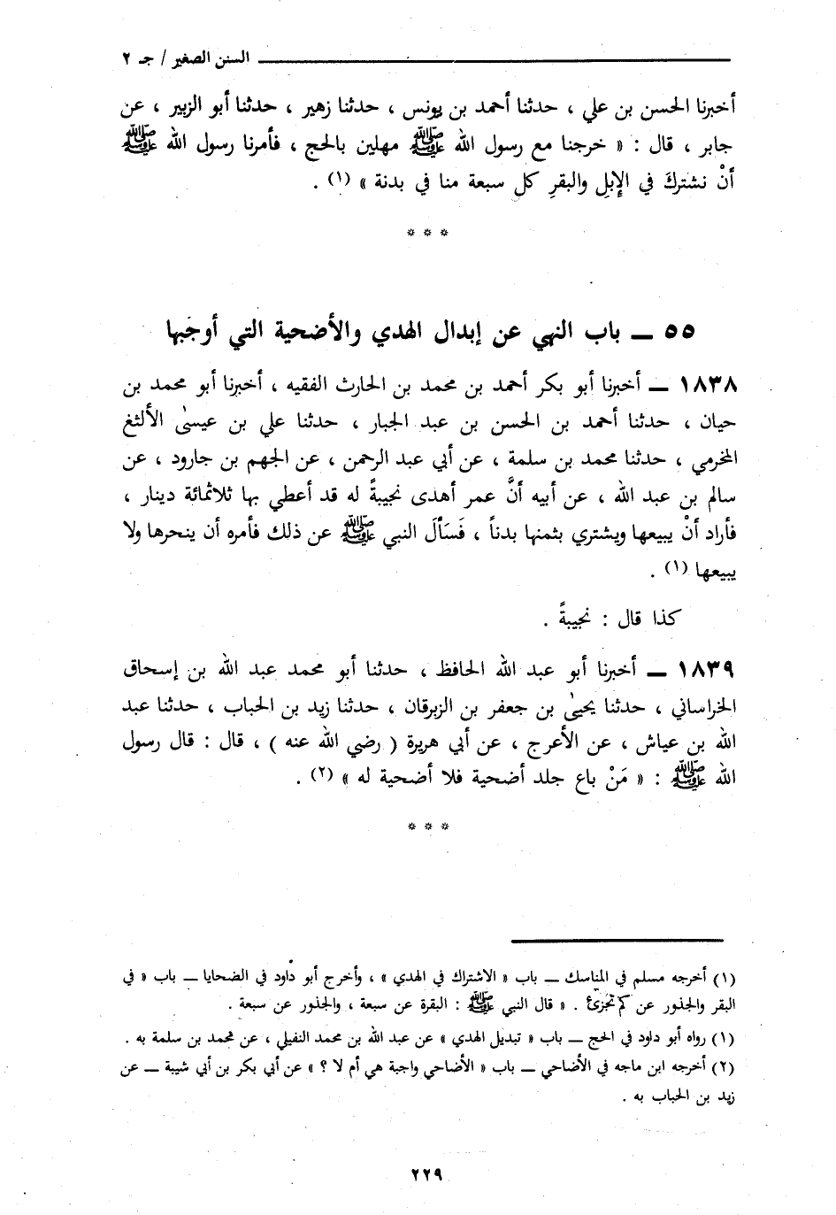 1838 - أَخْبَرَنَا أَبُو بَكْرٍ أَحْمَدُ بْنُ مُحَمَّدِ بْنِ الْحَارِثِ الْفَقِيهُ، نَا أَبُو مُحَمَّدِ بْنُ حَيَّانَ، ثنَا أَحْمَدُ بْنُ الْحَسَنِ بْنِ عَبْدِ الْجَبَّارِ، ثنَا عَلِيُّ بْنُ عِيسَى الْمُخَرِّمِيُّ، ثنَا مُحَمَّدُ بْنُ سَلَمَةَ، عَنْ أَبِي عَبْدِ الرَّحيم، عَنِ الْجَهْمِ بْنِ جَارُودٍ، عَنْ سَالِمِ بْنِ عَبْدِ اللَّهِ، عَنْ أَبِيهِ، أَنَّ عُمَرَ، أَهْدَى نَجِيبَةً لَهُ أُعْطِيَ بِهَا ثَلَاثَمِائَةِ دِينَارٍ، فَأَرَادَ أَنْ يَبِيعَهَا وَيَشْتَرِي بِثَمَنِهَا بُدْنًا، فَسَأَلَ النَّبِيُّ صَلَّى اللهُ عَلَيْهِ وَسَلَّمَ عَنْ ذَلِكَ " §فَأَمَرَهُ أَنْ يَنْحَرَهَا وَلَا يَبِيعُهَا. كَذَا قَالَ: نَجِيبَةٌ "