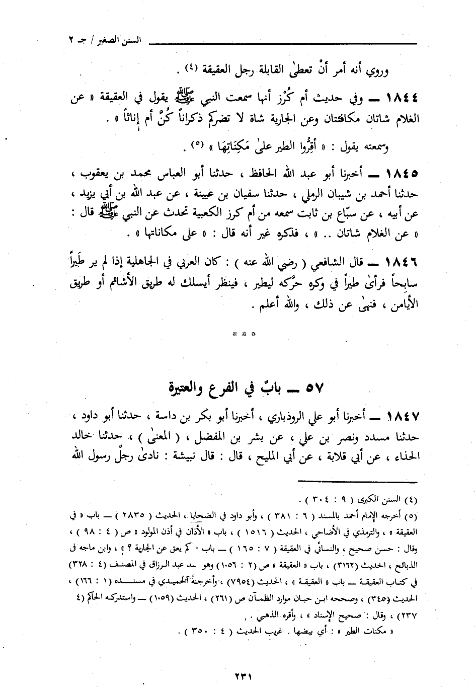1845 - أَخْبَرَنَا أَبُو عَبْدِ اللَّهِ الْحَافِظُ، ثنا أَبُو الْعَبَّاسِ مُحَمَّدُ بْنُ يَعْقُوبَ، ثنا أَحْمَدُ بْنُ شَيْبَانَ الرَّمْلِيُّ، ثنا سُفْيَانُ بْنُ عُيَيْنَةَ، عَنْ عَبْدِ اللَّهِ بْنِ أَبِي يَزِيدَ، عَنْ أَبِيهِ، عَنْ سِبَاعِ بْنِ ثَابِتٍ، سَمِعَهُ مِنْ أُمِّ كُرْزٍ الْكَعْبِيَّةِ، تُحَدِّثُ عَنِ النَّبِيِّ صَلَّى اللهُ عَلَيْهِ وَسَلَّمَ قَالَ: «§عَنِ الْغُلَامِ شَاتَانِ» فَذَكَرَهُ غَيْرَ أَنَّهُ قَالَ: «عَلَى مَكَانَاتِهَا»