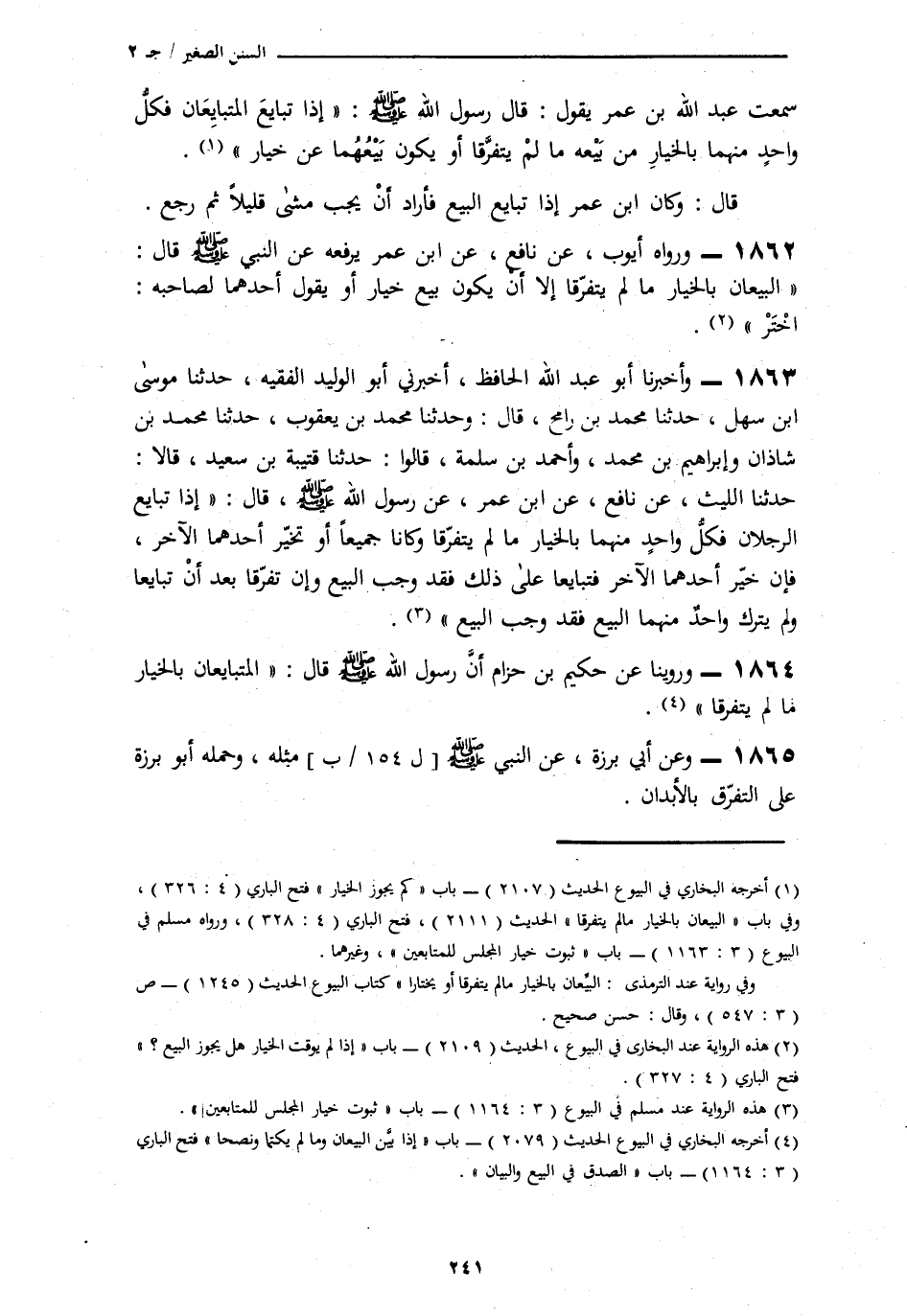 1864 - وَرُوِّينَا عَنْ حَكِيمِ بْنِ حِزَامٍ، أَنَّ رَسُولَ اللَّهِ صَلَّى اللهُ عَلَيْهِ وَسَلَّمَ قَالَ: «§الْمُتَبَايعَانِ بِالْخِيَارِ مَا لَمْ يَتَفَرَّقَا»،