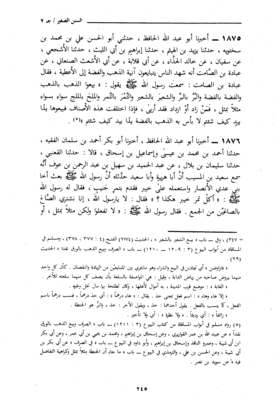 1875 - أَخْبَرَنَا أَبُو عَبْدِ اللَّهِ الْحَافِظُ، حَدَّثَنِي أَبُو الْحَسَنِ عَلِيُّ بْنُ مُحَمَّدِ بْنِ سِخْتَوَيْهِ، ثنَا يَزِيدُ بْنُ الْهَيْثَمِ، ثنَا إِبْرَاهِيمُ بْنُ أَبِي اللَّيْثِ، ثنَا الْأَشْجَعِيُّ، عَنْ سُفْيَانَ، عَنْ خَالِدٍ الْحَذَّاءِ، عَنْ أَبِي قِلَابَةَ، عَنْ أَبِي الْأَشْعَثَ الصَّنْعَانِيِّ، عَنْ عُبَادَةَ بْنِ الصَّامِتِ، أَنَّهُ شَهِدَ النَّاسَ يَتَبَايَعُونَ آنِيَةَ الذَّهَبِ وَالْفِضَّةِ إِلَى الْأَعْطِيَةِ، فَقَالَ عُبَادَةُ بْنُ الصَّامِتِ: سَمِعْتُ رَسُولَ اللَّهِ صَلَّى اللهُ عَلَيْهِ وَسَلَّمَ يَقُولُ: § «بِيعُوا الذَّهَبَ بِالذَّهَبِ وَالْفِضَّةَ بِالْفِضَّةِ وَالْبُرَّ بِالْبُرِّ وَالشَّعِيرَ بِالشَّعِيرِ وَالتَّمْرَ بِالتَّمْرِ وَالْمِلْحَ بِالْمِلْحِ سَوَاءً بِسَوَاءٍ مِثْلًا بِمِثْلٍ، فَمَنْ زَادَ أَوِ ازْدَادَ فَقَدْ أَرْبَى، فَإِذَا اخْتَلَفَتْ هَذِهِ الْأَصْنَافُ فَبِيعُوهَا يَدًا بِيَدٍ كَيْفَ شِئْتُمْ لَا بَأْسَ بِهِ الذَّهَبُ بِالْفِضَّةِ يَدًا بِيَدٍ كَيْفَ شِئْتُمْ وَالْبُرُّ بِالشَّعِيرِ يَدًا بِيَدٍ كَيْفَ شِئْتُمْ»