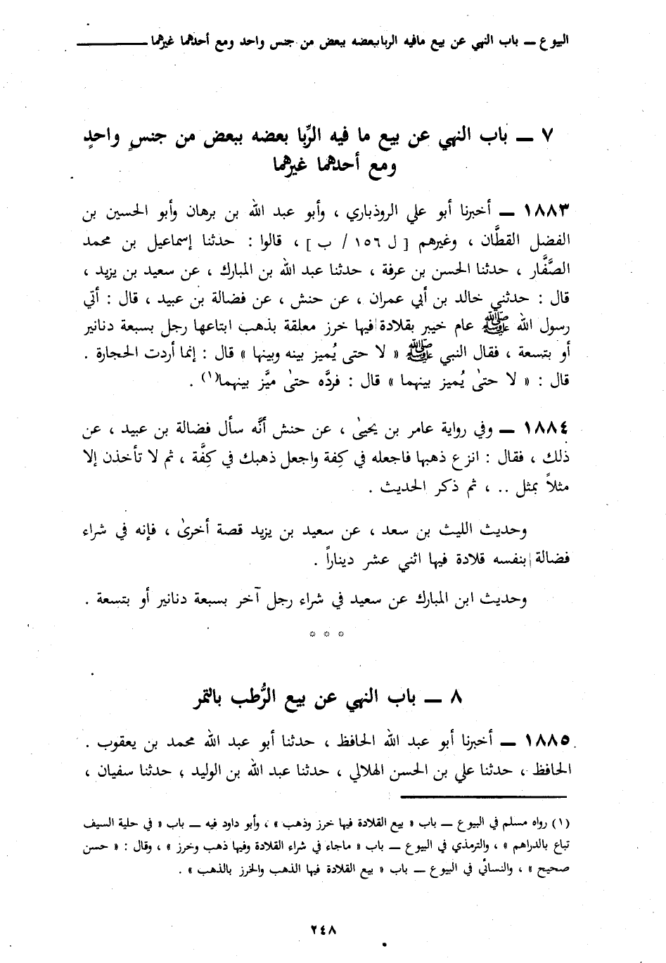 1883 - أَخْبَرَنَا أَبُو عَلِيٍّ الرُّوذْبَارِيُّ، وَأَبُو عَبْدِ اللَّهِ بْنُ بُرْهَانَ، وَأَبُو الْحُسَيْنِ بْنُ الْفَضْلِ الْقَطَّانُ، وَغَيْرُهُمْ، قَالُوا: أنَا إِسْمَاعِيلُ بْنُ مُحَمَّدٍ الصَّفَّارُ، ثنَا الْحَسَنُ بْنُ عَرَفَةَ، ثنَا عَبْدُ اللَّهِ بْنُ الْمُبَارَكِ، عَنْ سَعِيدِ بْنِ يَزِيدَ، قَالَ: ثنا خَالِدُ بْنُ أَبِي عِمْرَانَ، عَنْ حَنَشٍ، عَنْ فَضَالَةَ بْنِ عُبَيْدٍ، قَالَ: أُتِيَ رَسُولُ اللَّهِ صَلَّى اللهُ عَلَيْهِ وَسَلَّمَ عَامَ خَيْبَرَ بِقِلَادَةٍ فِيهَا خَرَزٌ مُعَلَّقَةٌ بِذَهَبٍ ابْتَاعَهَا رَجُلٌ بِسَبْعَةِ دَنَانِيرَ أَوْ بِتِسْعَةٍ، فَقَالَ النَّبِيُّ صَلَّى اللهُ عَلَيْهِ وَسَلَّمَ: «§لَا حَتَّى يُمَيِّزَ بَيْنَهُ وَبَيْنَهَا» قَالَ: إِنَّمَا أَرَدْتُ الْحِجَارَةَ. قَالَ: «لَا حَتَّى يُمَيِّزَ بَيْنَهُمَا» قَالَ: فَرَدَّهُ حَتَّى مَيَّزَ بَيْنَهُمَا